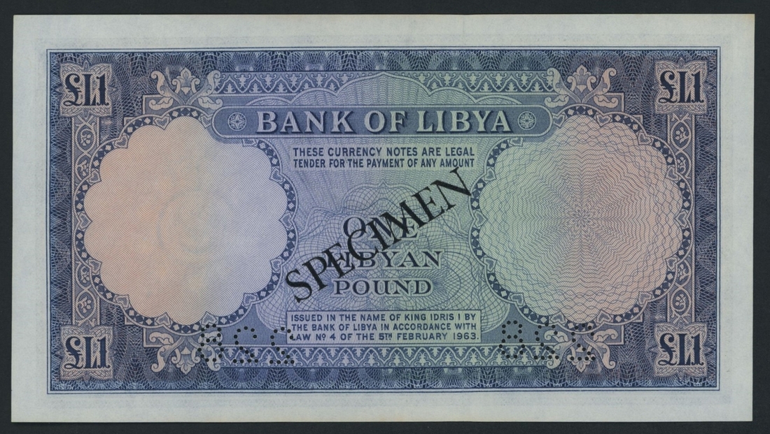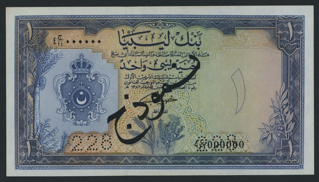 National Bank of Libya, specimen £1, 1963, serial number 4 C/11 000000 228, specimen number perforations,