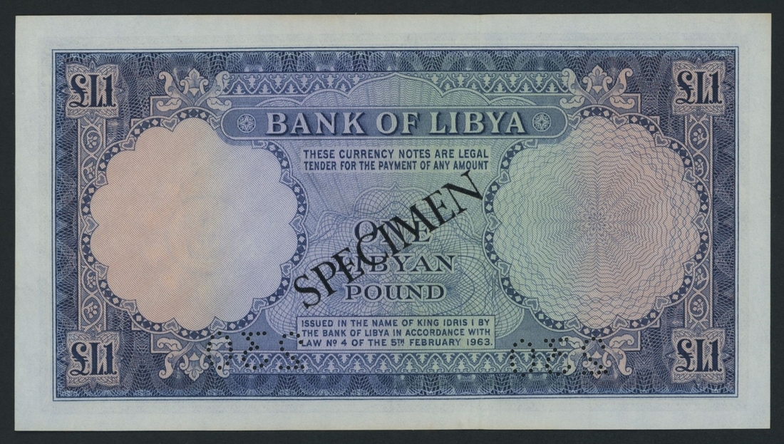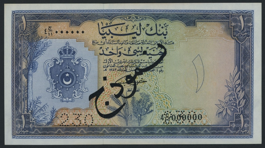 National Bank of Libya, specimen £1, 1963, serial number 4 C/11 000000 230, specimen number perforations,