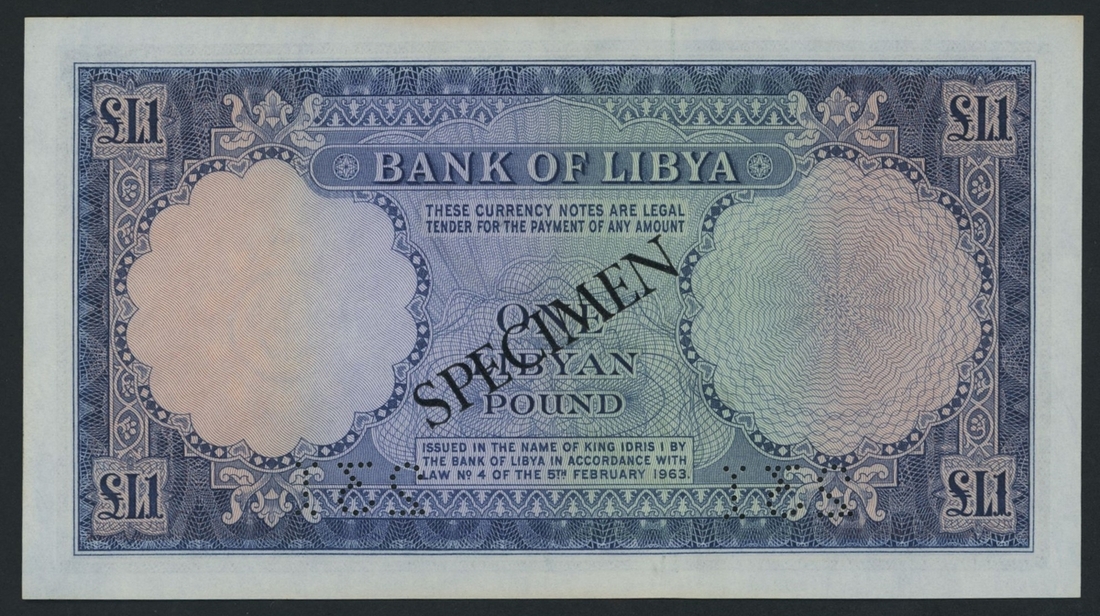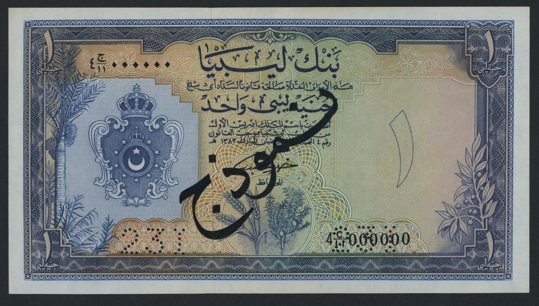 National Bank of Libya, specimen £1, 1963, serial number 4 C/11 000000 231, specimen number perforations,