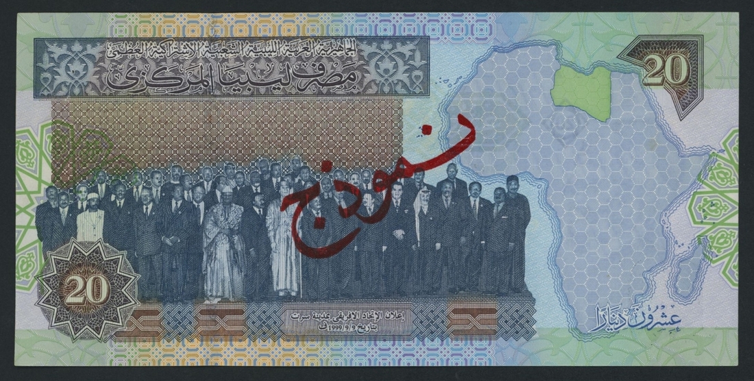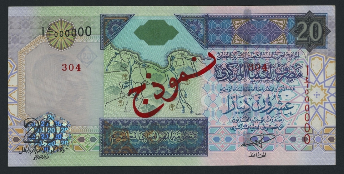 Central Bank of Libya, specimen 20 Dinars, ND (2008), serial number 1 '/1 000000 304, (Pick 67s BNB B534bs), uncirculated, security thread insertion crease