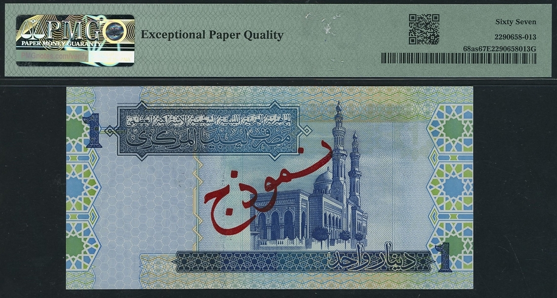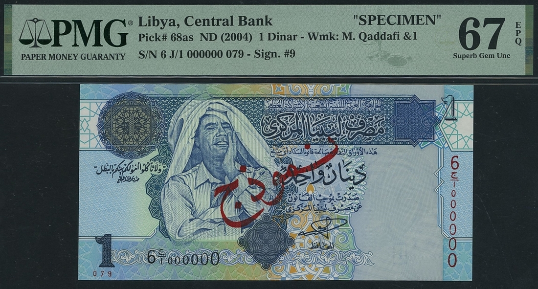 (x) Central Bank of Libya, specimen 1 Dinar, ND (2004), serial number 6 J/1 000000 079, signature Abdel-Hamid,
