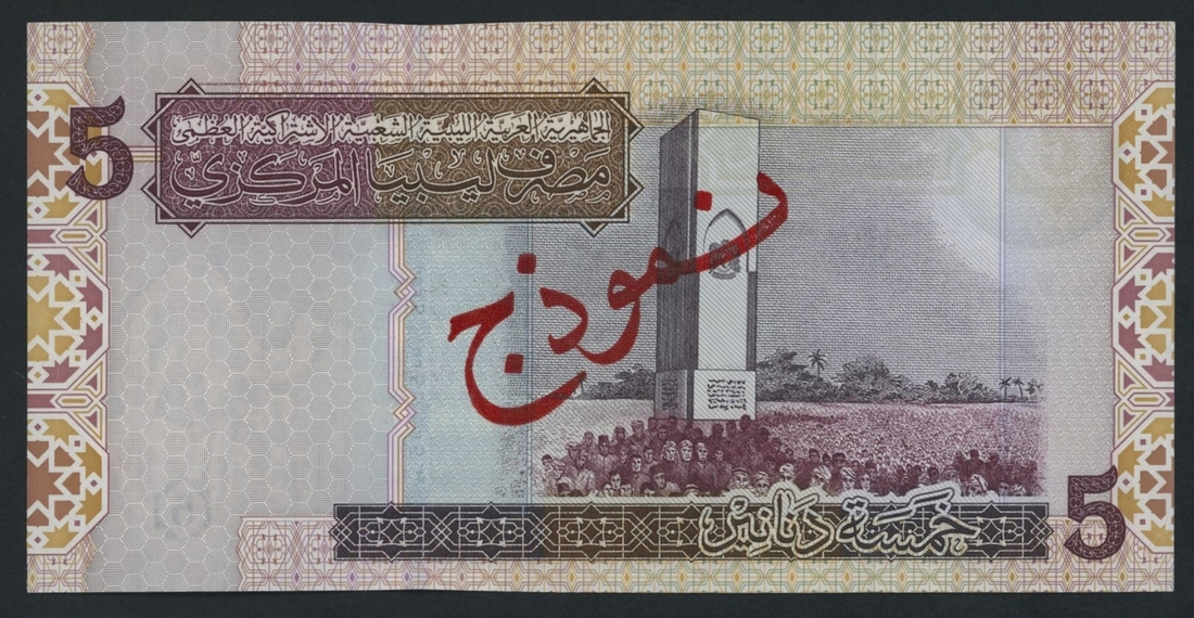 Central Bank of Libya, specimen 5 Dinars, ND (2008), serial number 6 B/121 000000 018, (Pick 69s, BNB B532as), uncirculated, security thread insertion crease