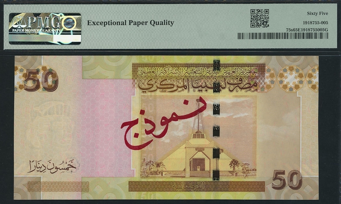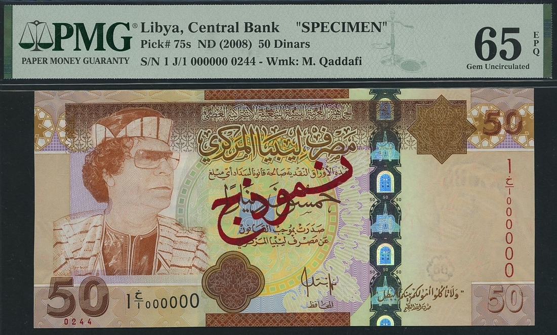 (x) Central Bank of Libya, specimen 50 Dinars, ND (2008), serial number 1 J/1 000000 0244, signature Bengdara,