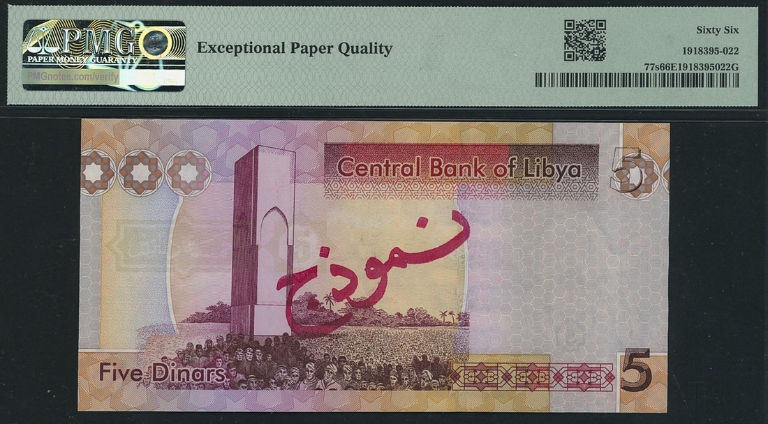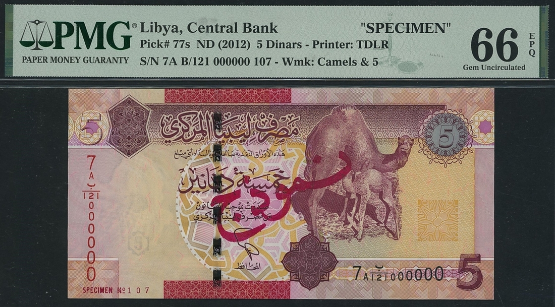 (x) Central Bank of Libya, specimen 5 Dinars, ND (2012), serial number 7A B/121 000000 107, signature Al-Kabeer,