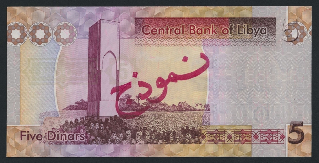 Central Bank of Libya, specimen 5 Dinars, ND (2011), serial number 7A B/121 000000 216, (Pick 77s, BNB B540as), uncirculated, security thread insertion crease