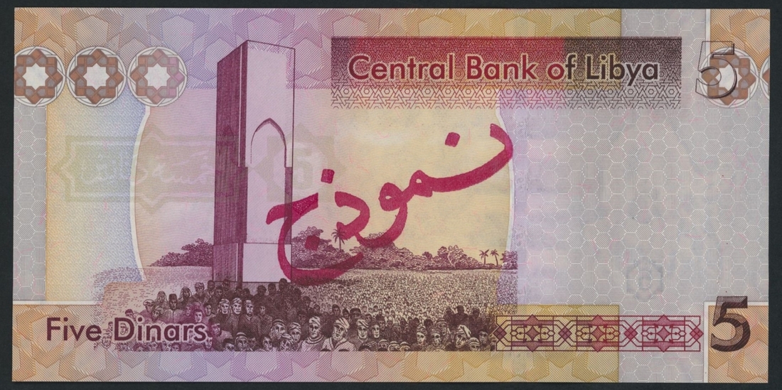 Central Bank of Libya, specimen 5 Dinars, ND (2011), serial number 7A B/121 000000 217, (Pick 77s, BNB B540as), uncirculated, security thread insertion crease