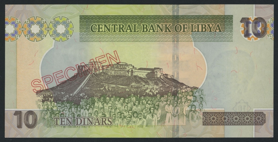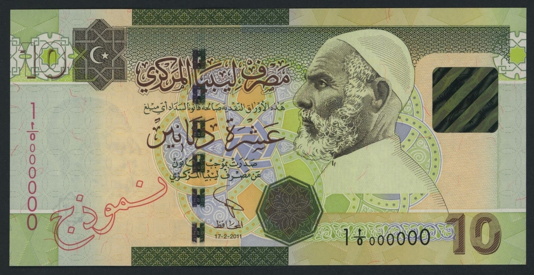 Central Bank of Libya, 10 Dinars, ND (2011), serial number 1 A/0 000000, no specimen number