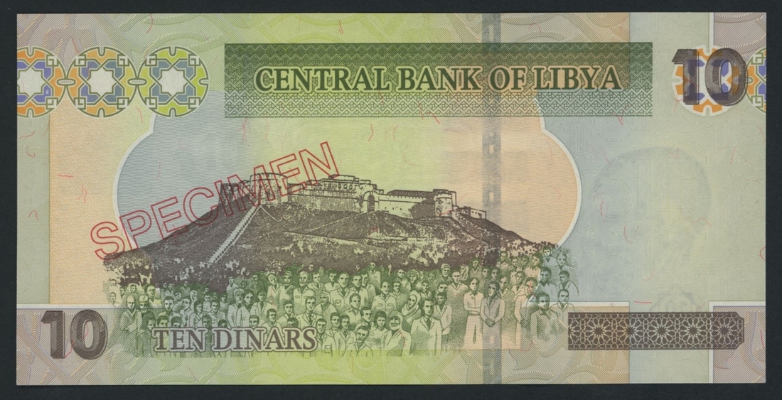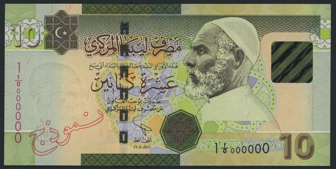 Central Bank of Libya, 10 Dinars, ND (2011), serial number 1 A/0 000000, no specimen number