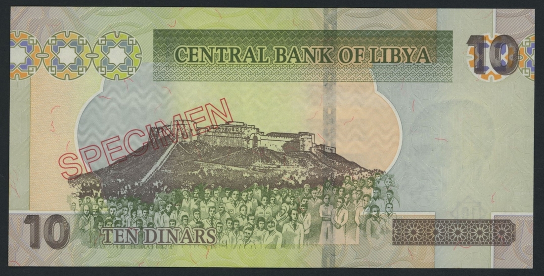 Central Bank of Libya, 10 Dinars, ND (2011), serial number 1 A/0 000000, no specimen number