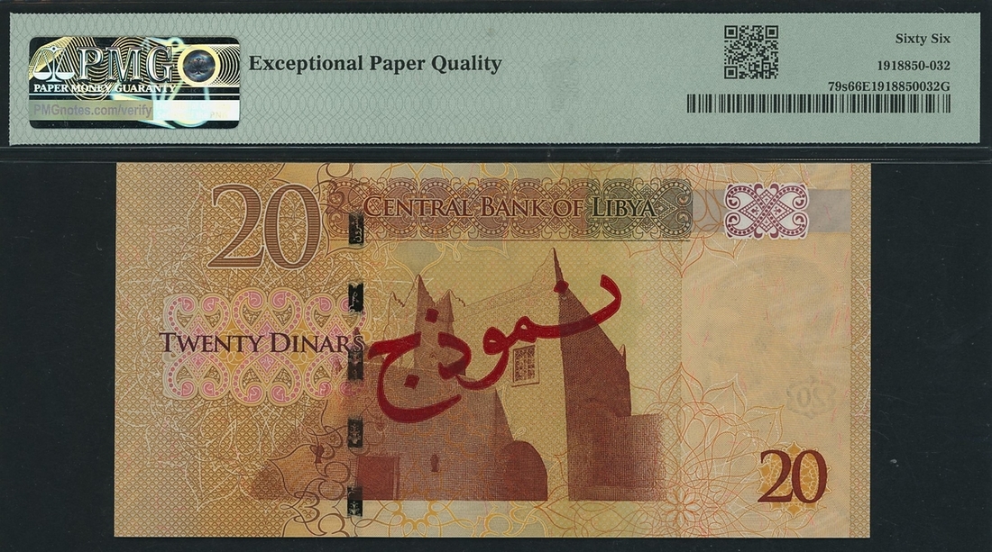 (x) Libya, Central Bank, specimen 20 Dinars, ND (2013), serial number 1 D/1 0000000 91, (Pick 79s), in PMG holder 66 EPQ Gem Uncirculated