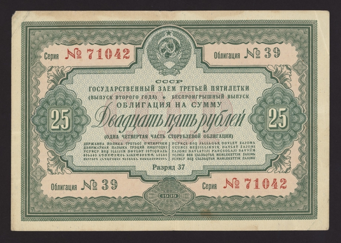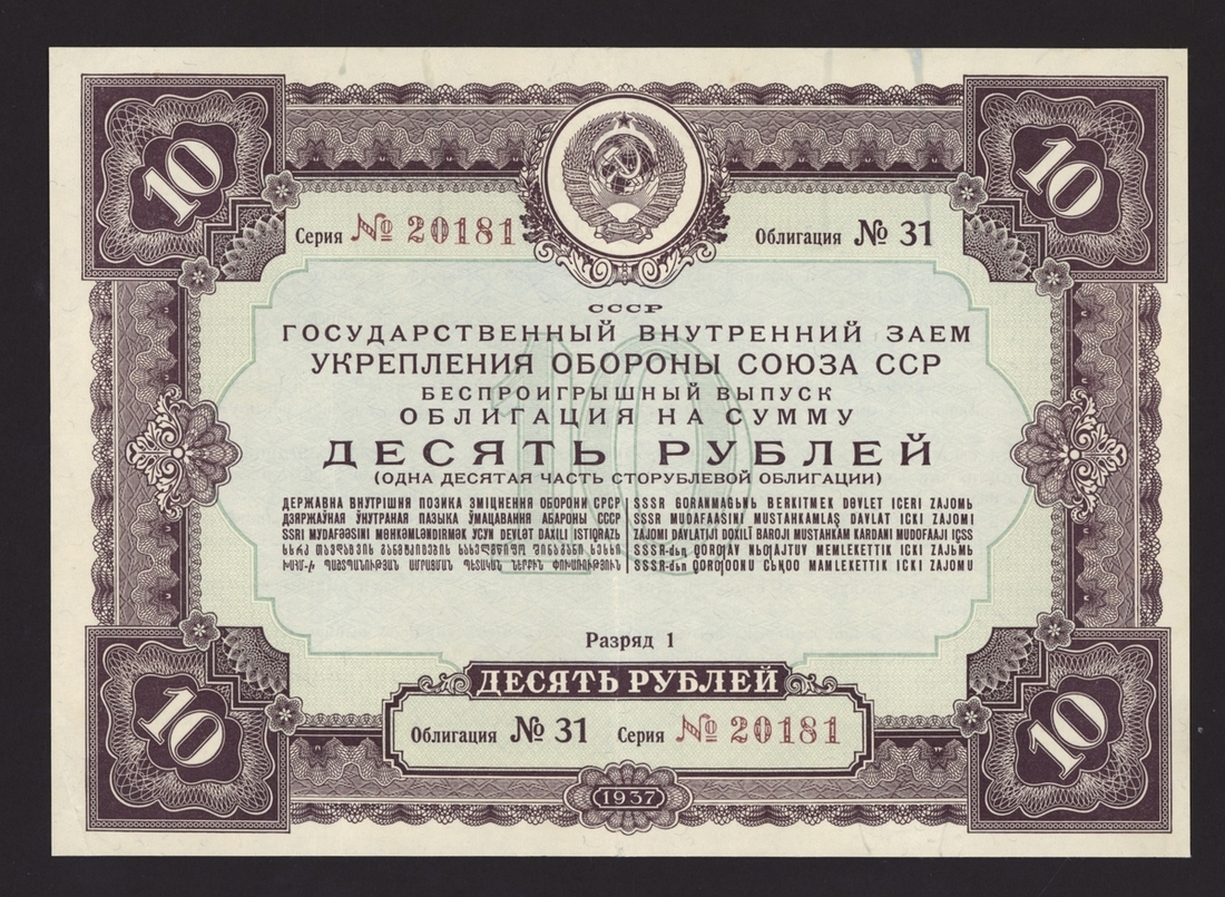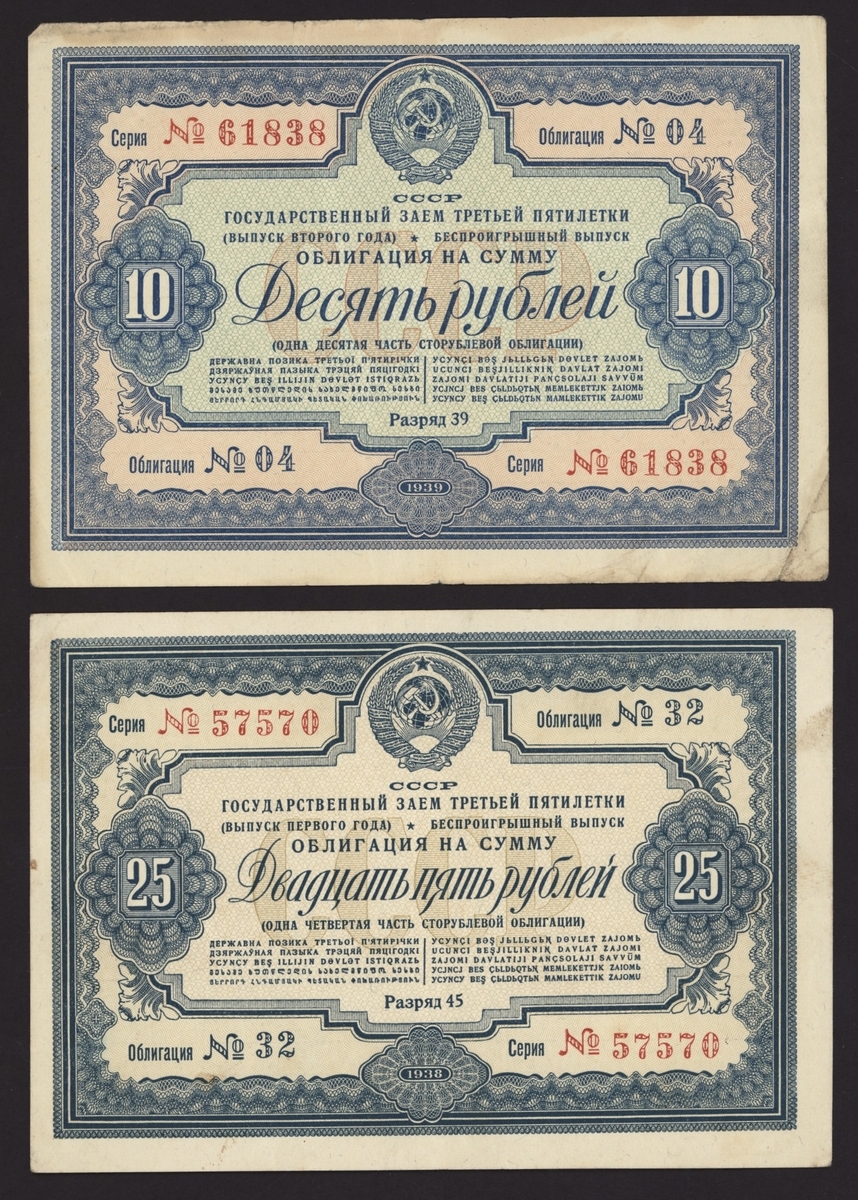 Russia, Soviet State War Loan, [4 notes] 10, 25 Rubles, 1937-9, 10 Rubles, 1937, serial number 31 20181;
