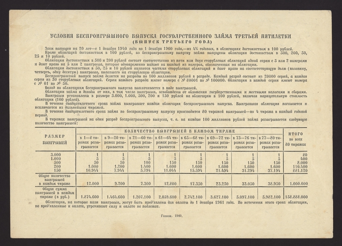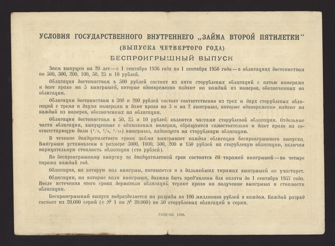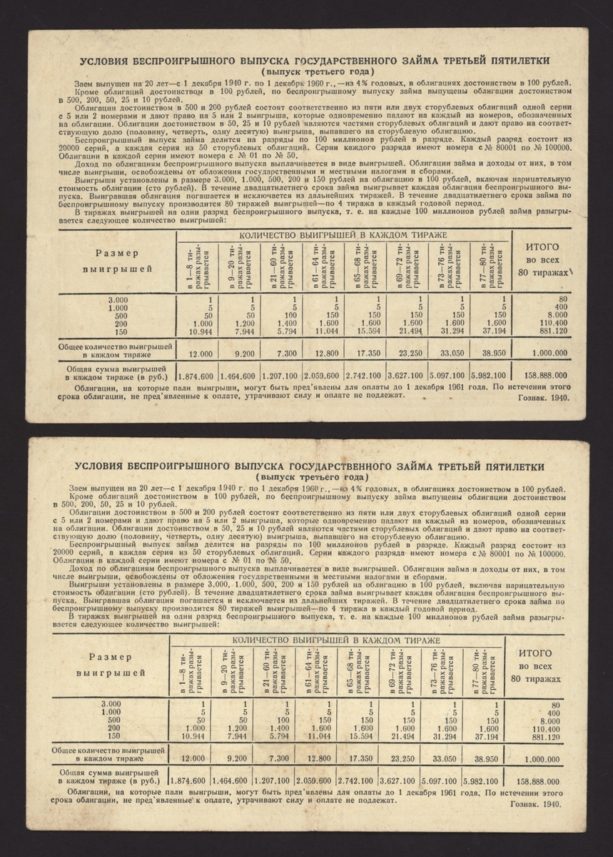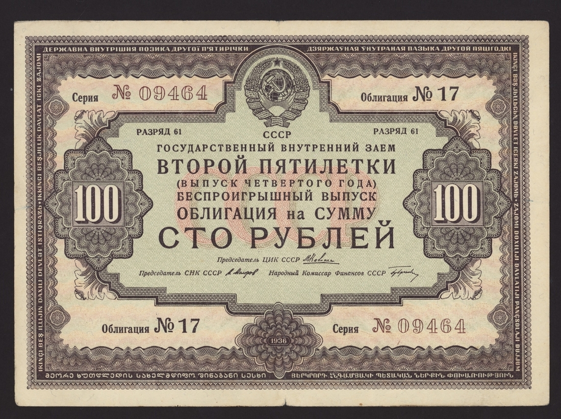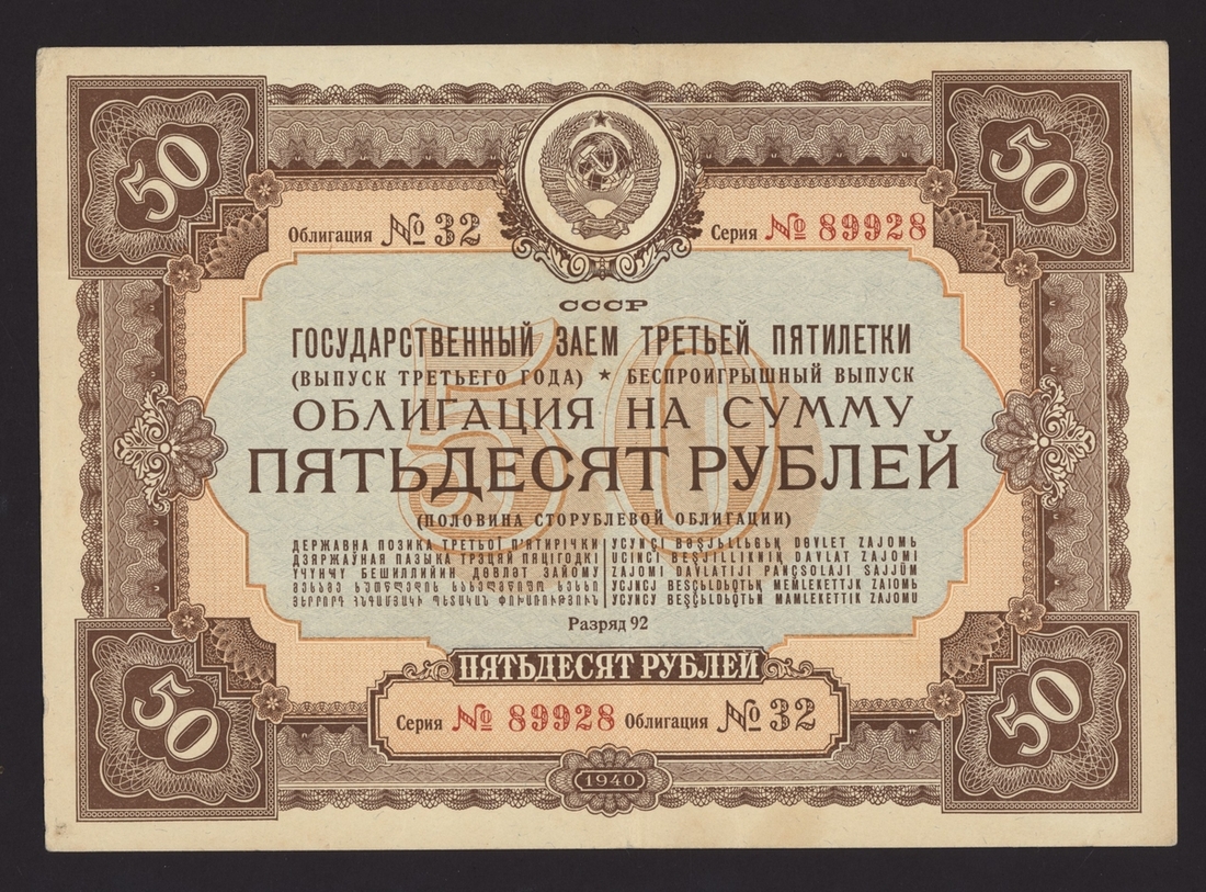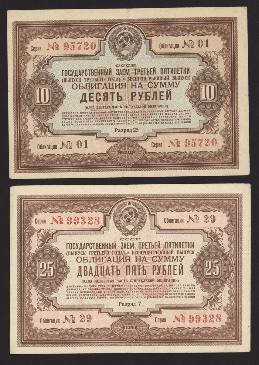 Russia, Soviet State War Loan, [4 notes] 10, 25, 50, 100 Rubles, 1940, 10 Rubles, 1940, serial number 01 95720;