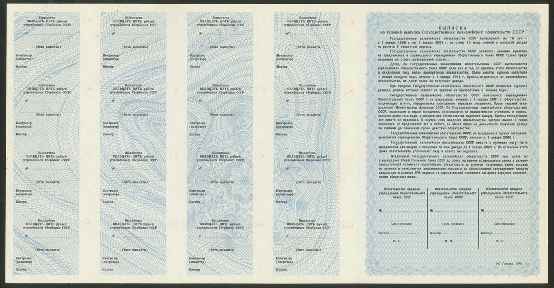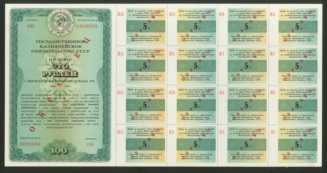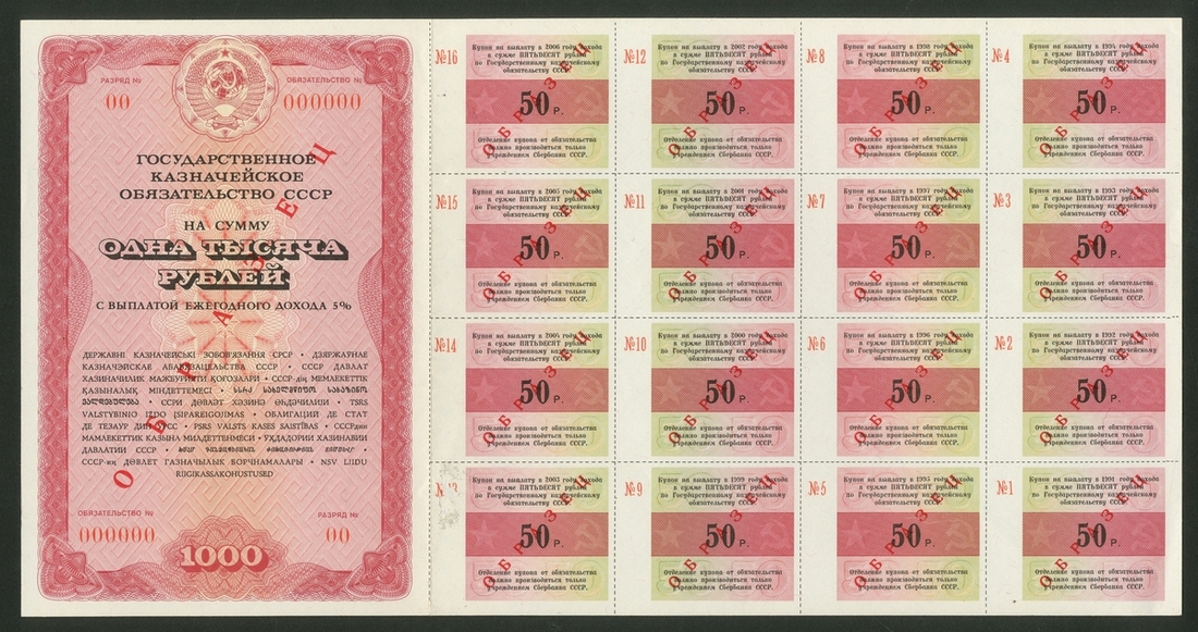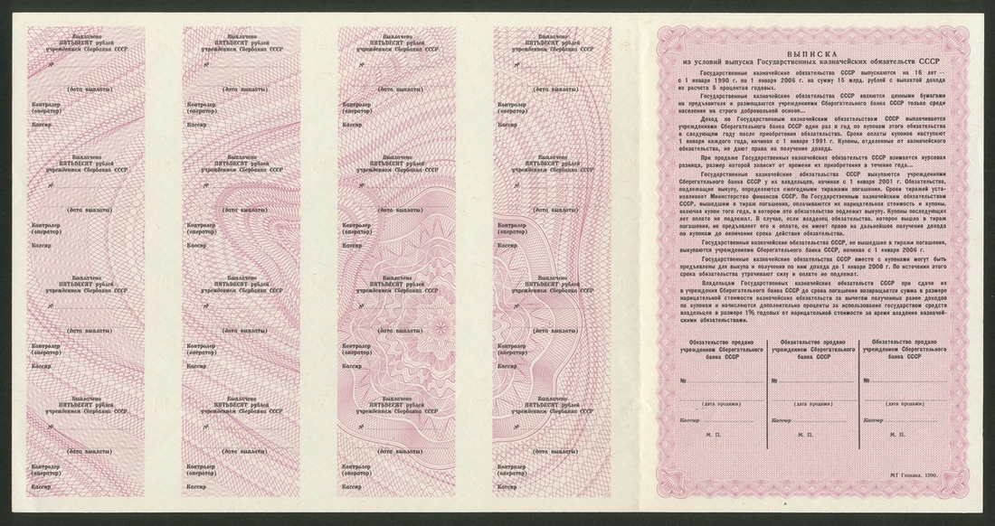 Russia, Soviet State Bond Certificates, [4 notes] specimen 2 Rubles 50 Kopeks, 5, 25, 50 Rubles, 1990, (Pick unlisted), uncirculated, scarce (4 notes), ''Property of a British Gentleman''