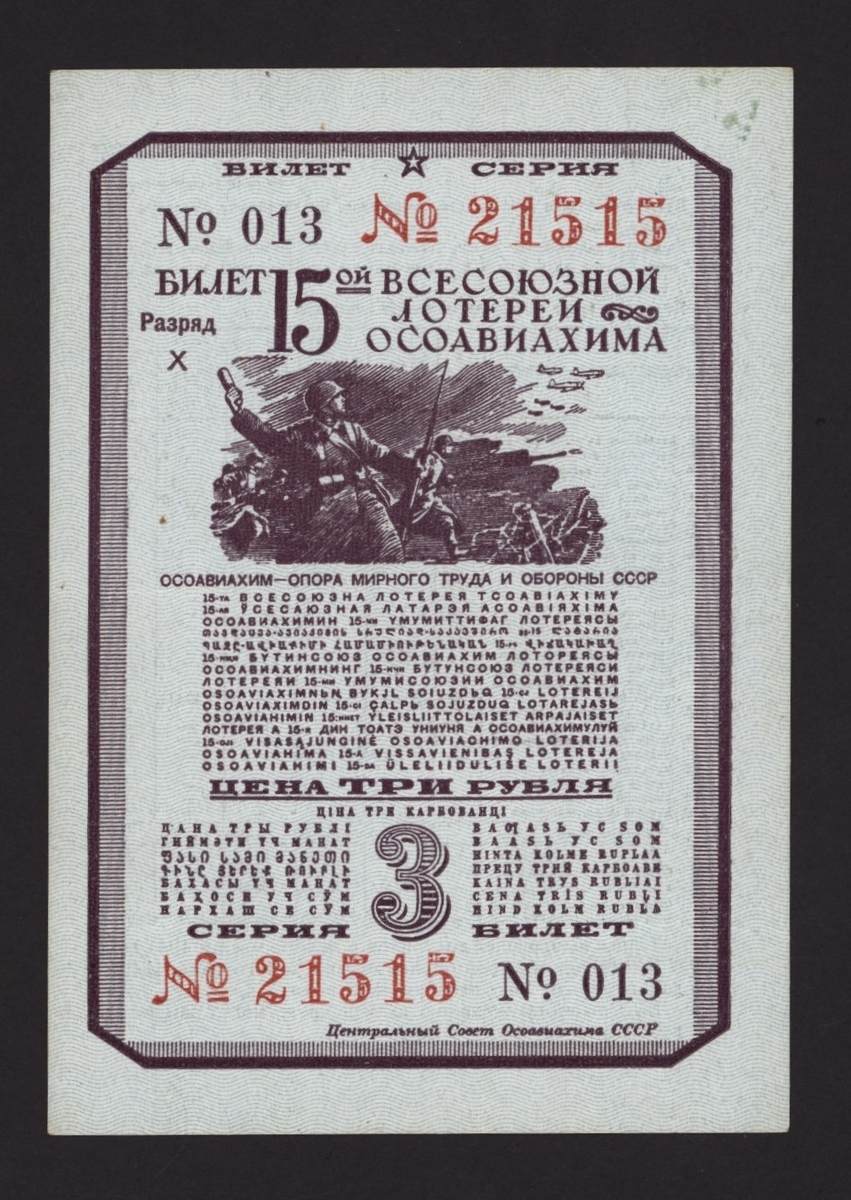 Russia, Soviet State War Loan and Lottery Ticket, [3 notes] 3, 10, 20 Rubles, 1941-42, 3 Rubles, 1941, serial number 013 21515;