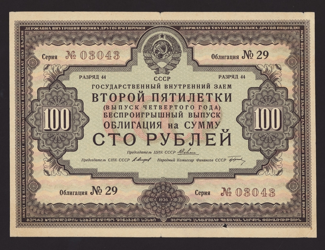 Russia, Soviet State War and Defence Loans, [3 notes] 1, 5, 100 Rubles, 1936-9, 100 Rubles, 1936, serial number 29 03043;
