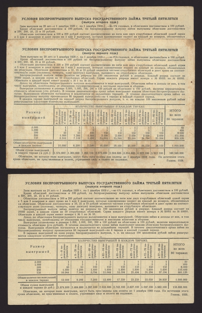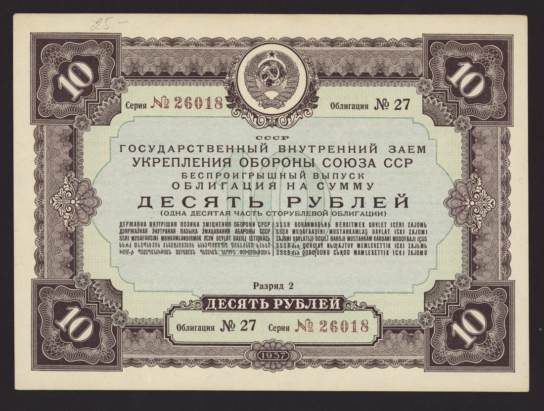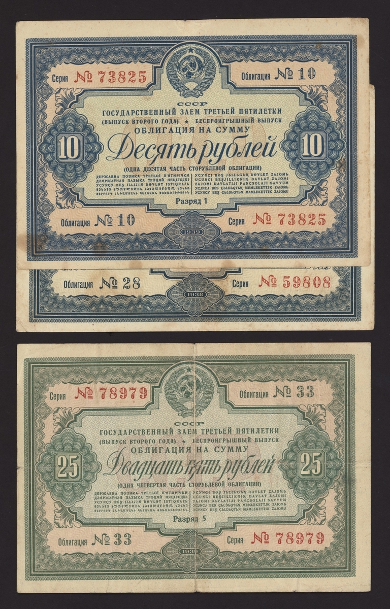 Russia, Soviet State War Loan, [4 notes] 10, 25 Rubles, 1939- 10 Rubles, 1937, serial number 27 26018;