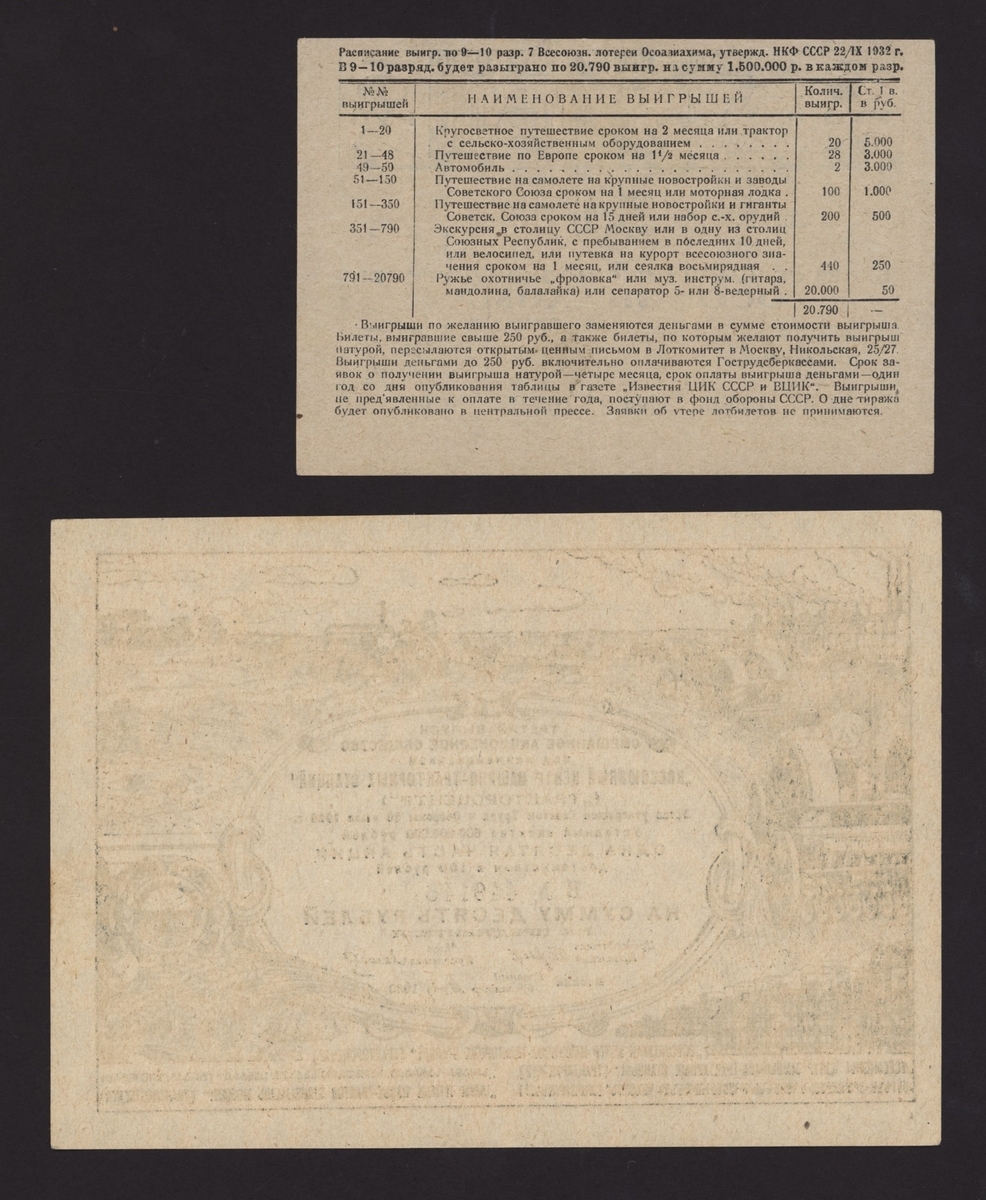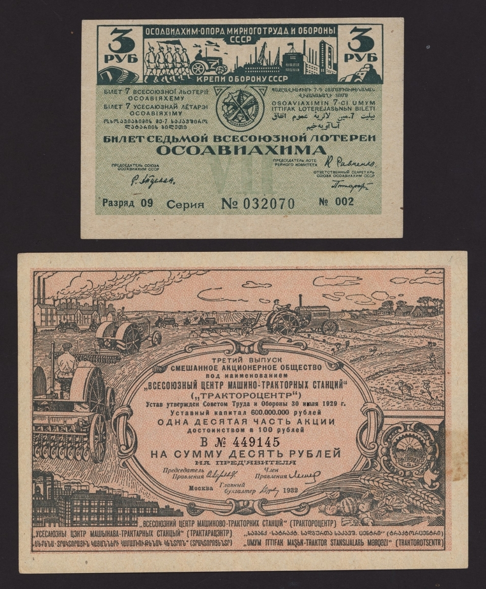 Russia, Soviet State Lottery Ticket and Share, [2 notes] 3, 5 Rubles, 1932, 3 Rubles, (1932), serial number 002 032070;