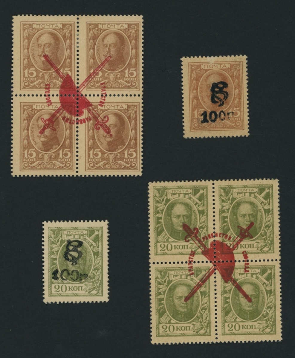 Postage Stamp Currency Issue, Revolutionary Overprints, Russia, [4 pieces] 15, 20 Kopeks, 1917-18, 100 Ruble overprint on two notes, one revolutionary overprint is inverted
