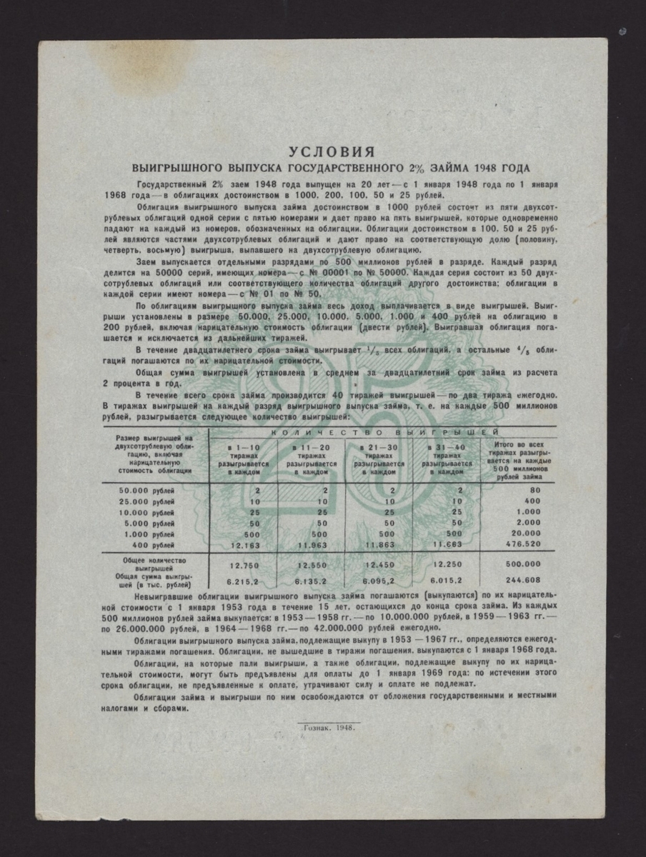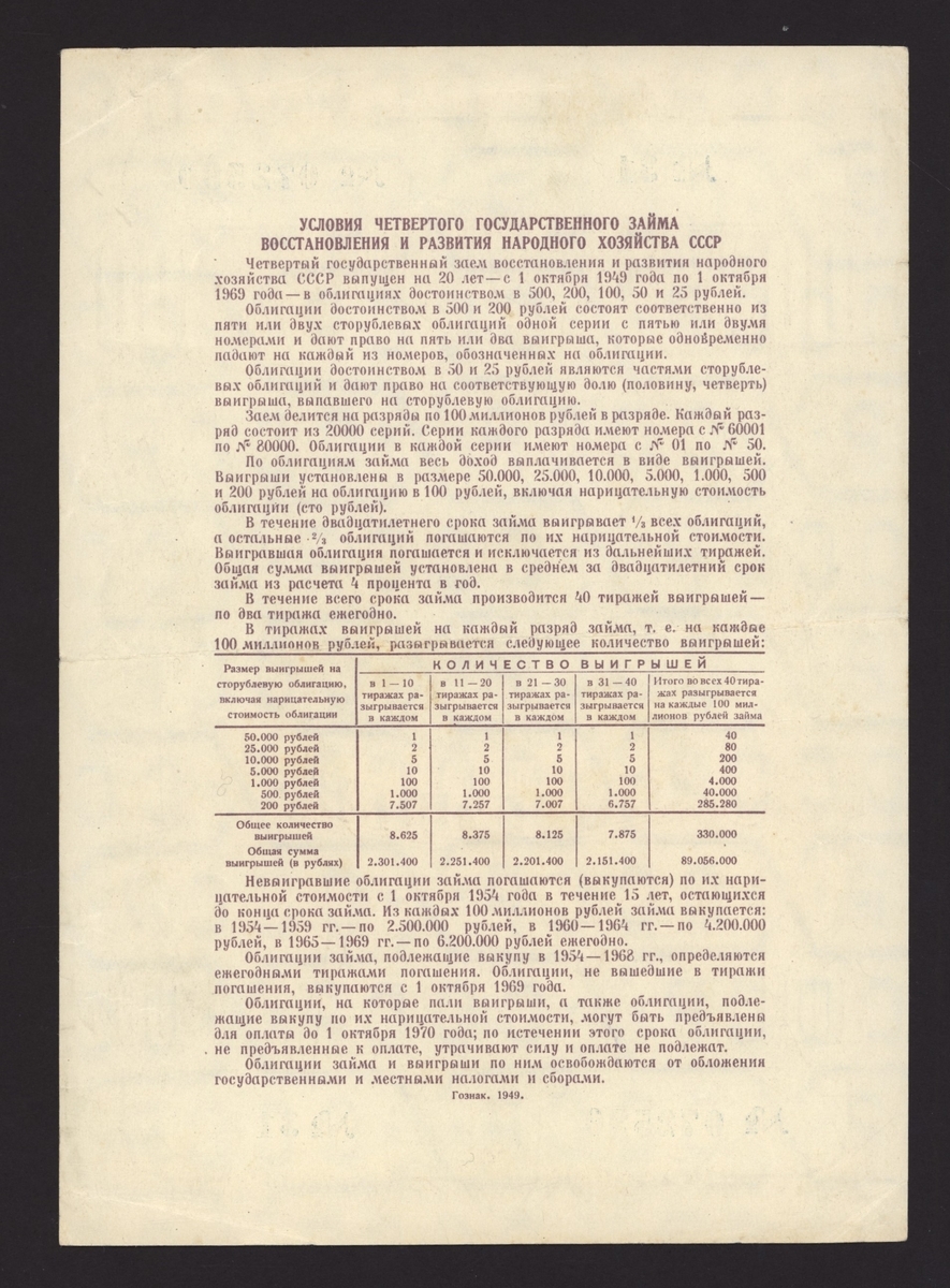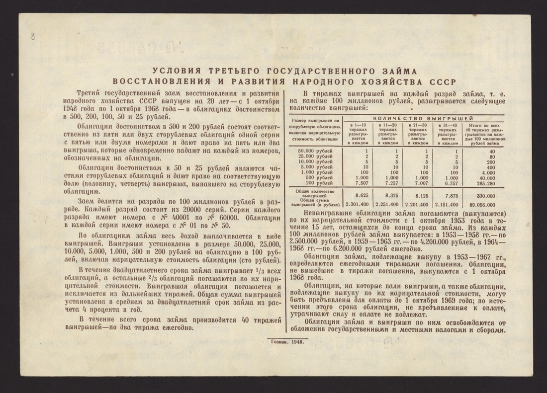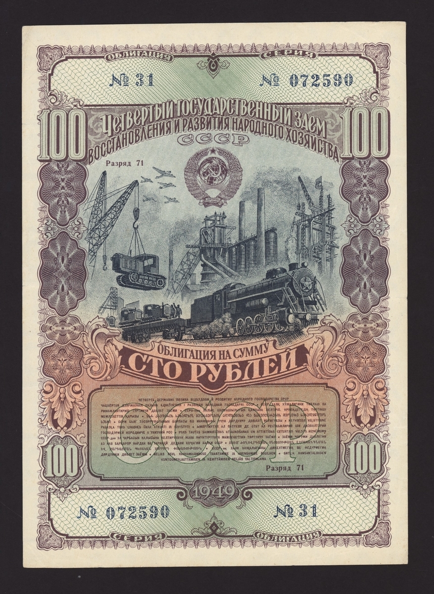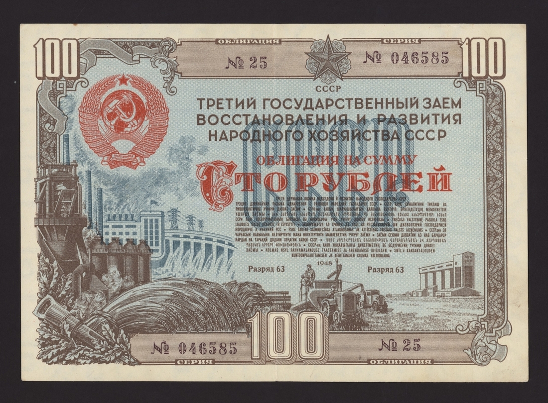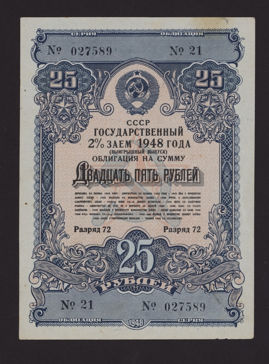 Russia, Soviet State Lottery Ticket, [3 notes] 25, 100 Rubles, 1948-9, 25 Rubles, 1948, serial number 21 027589;