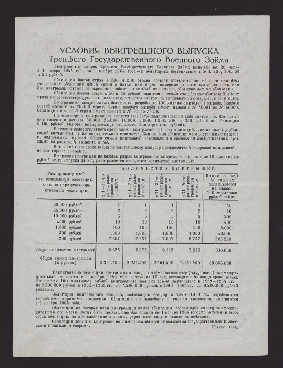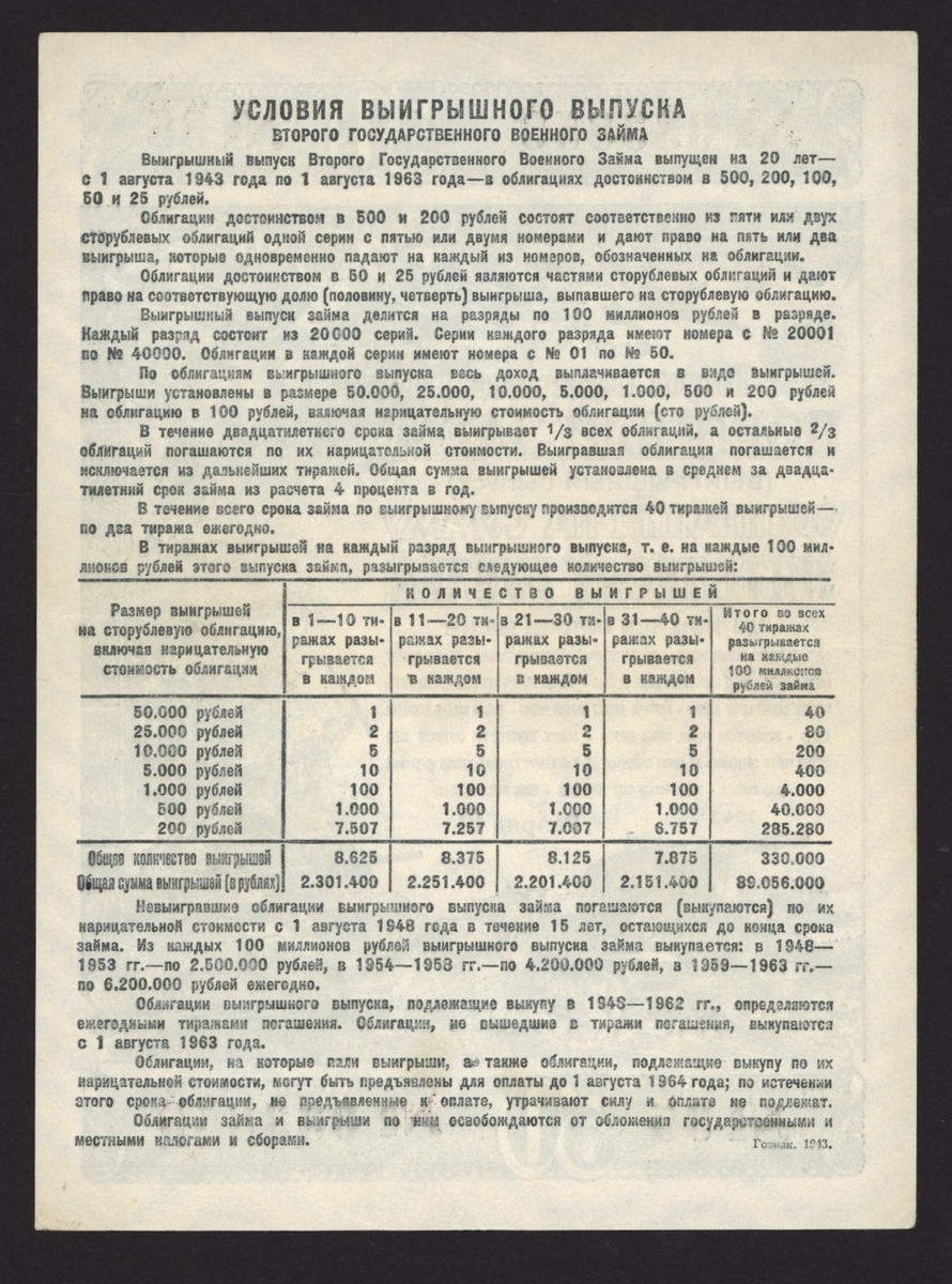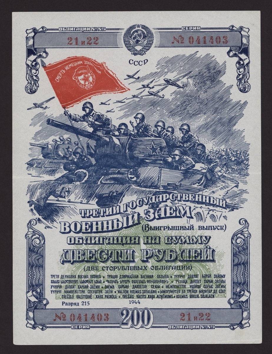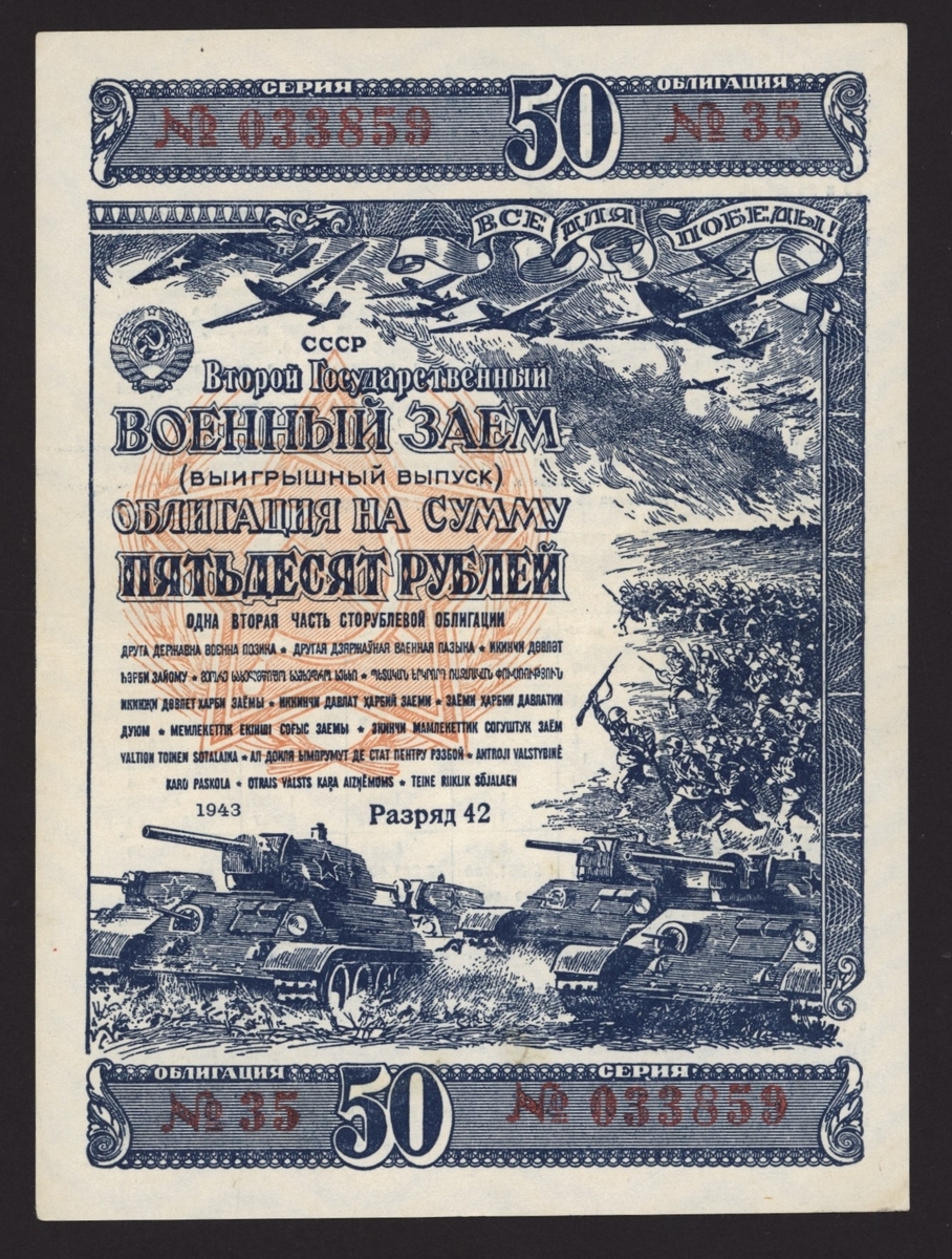 Russia, Soviet State War Loan and Bond, [2 notes] 50, 200 Rubles, 1943-4, 50 Rubles, 1943, serial number 35 033859;