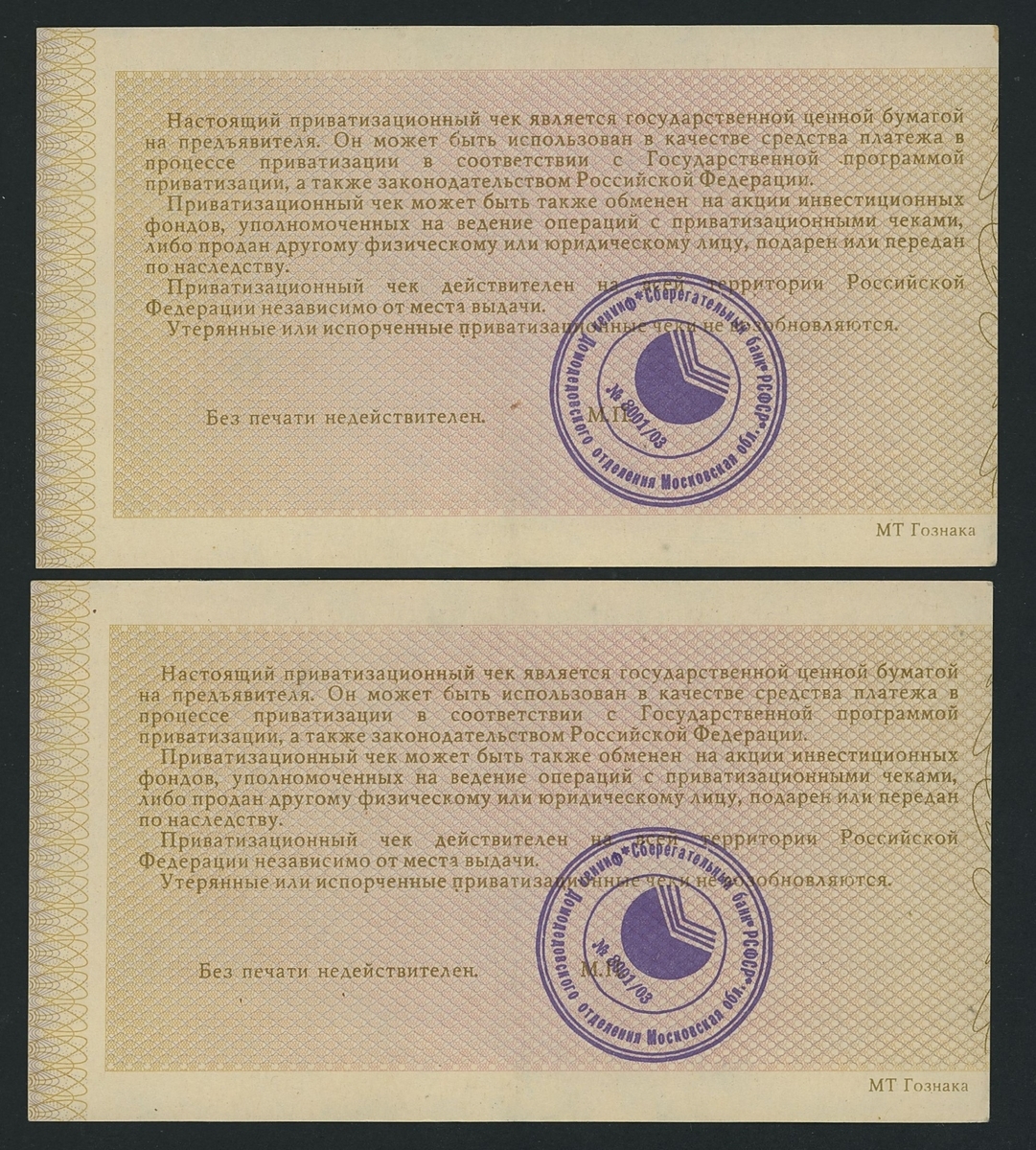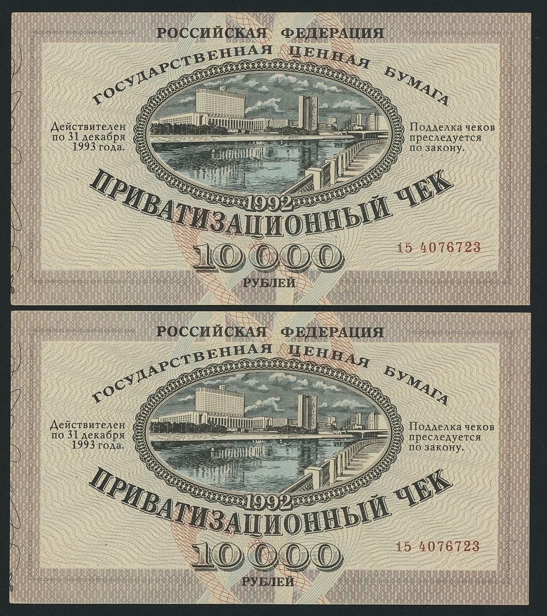 Russia Federation, Privatisation Note, [2 notes] 10,000 Rubles, 1992 (31st December 1993), serial number 15 4076723, solid good extremely fine (2 notes)