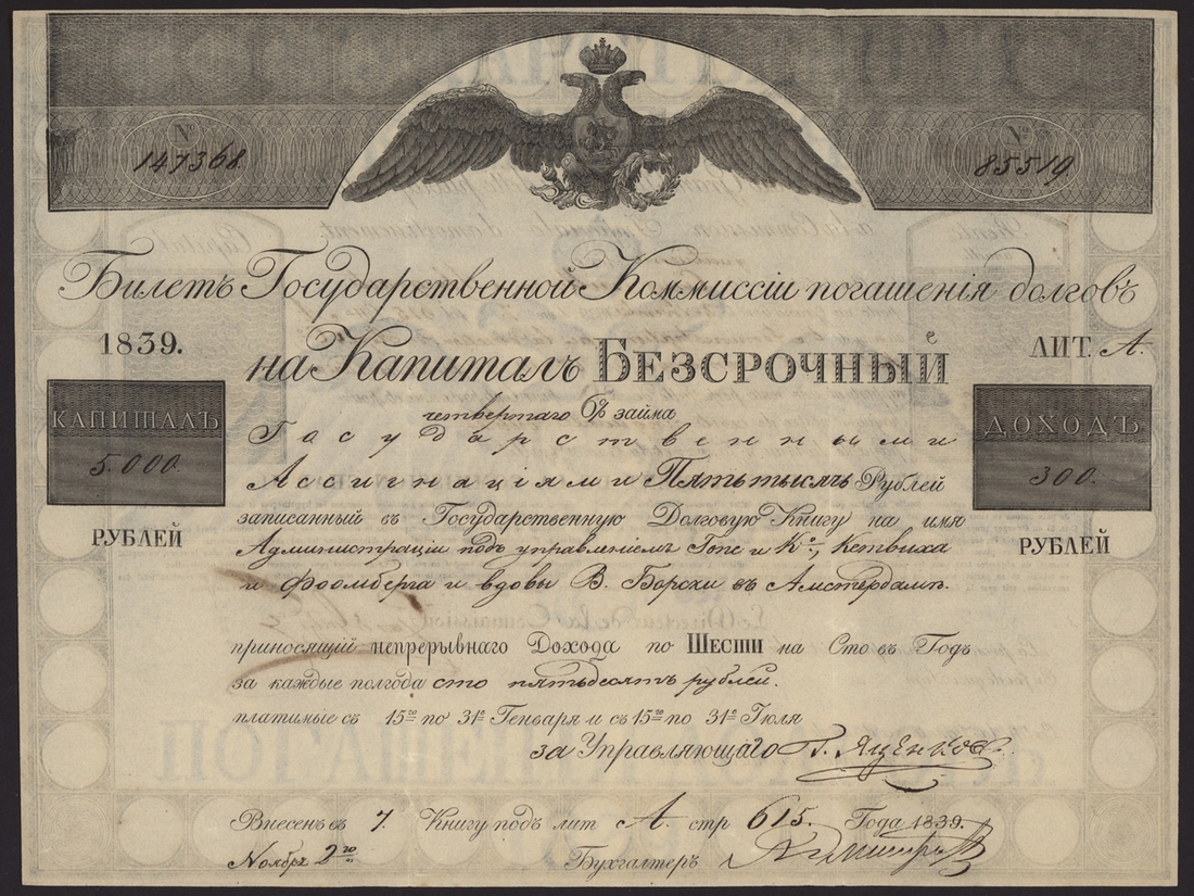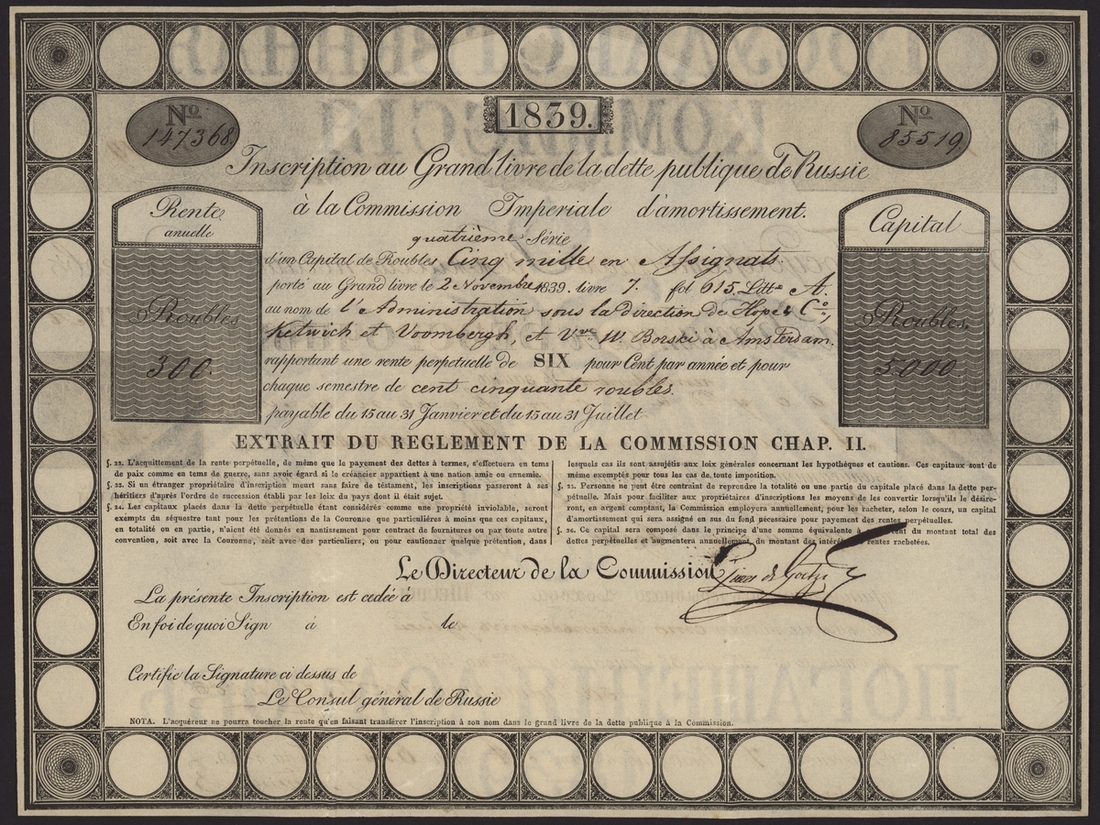 Russia, Imperial Bond Certificate, 5000 Rubles, 1839, hand signed