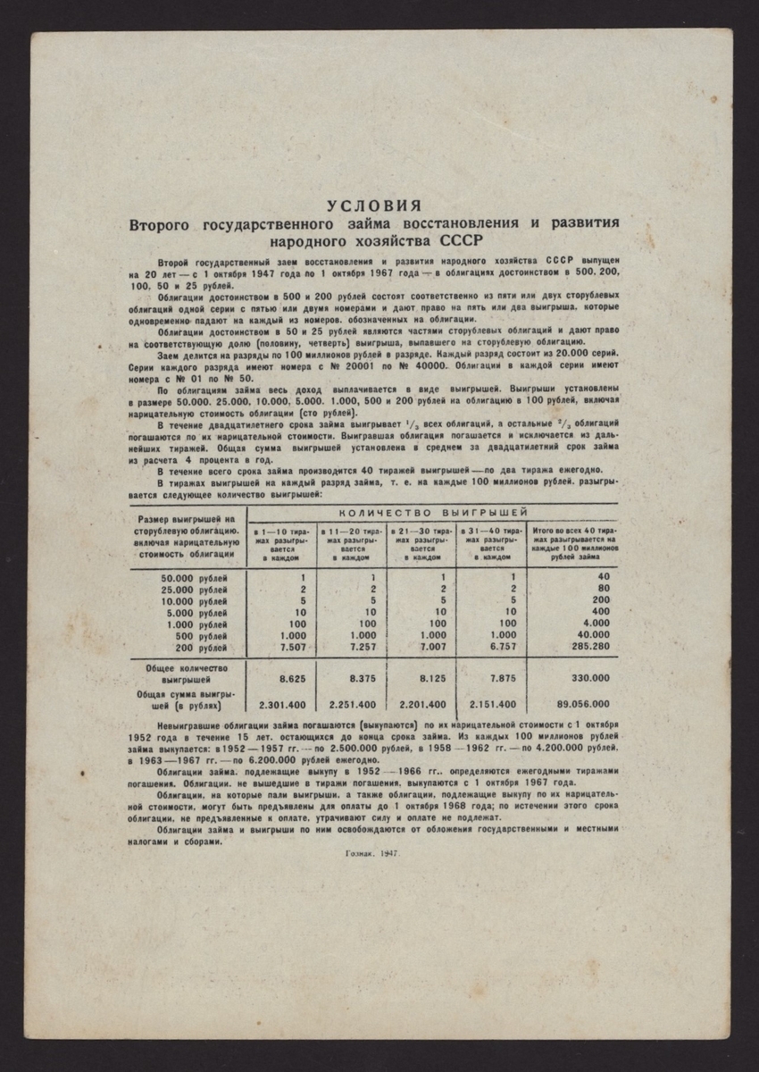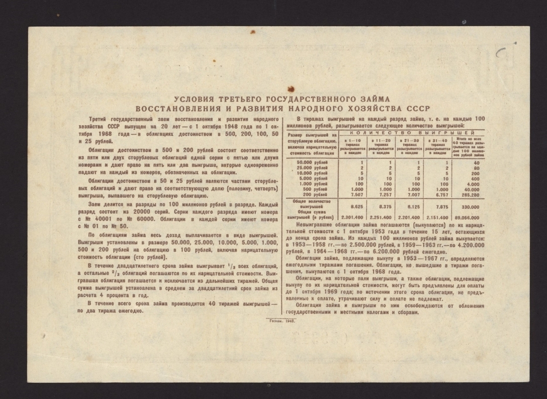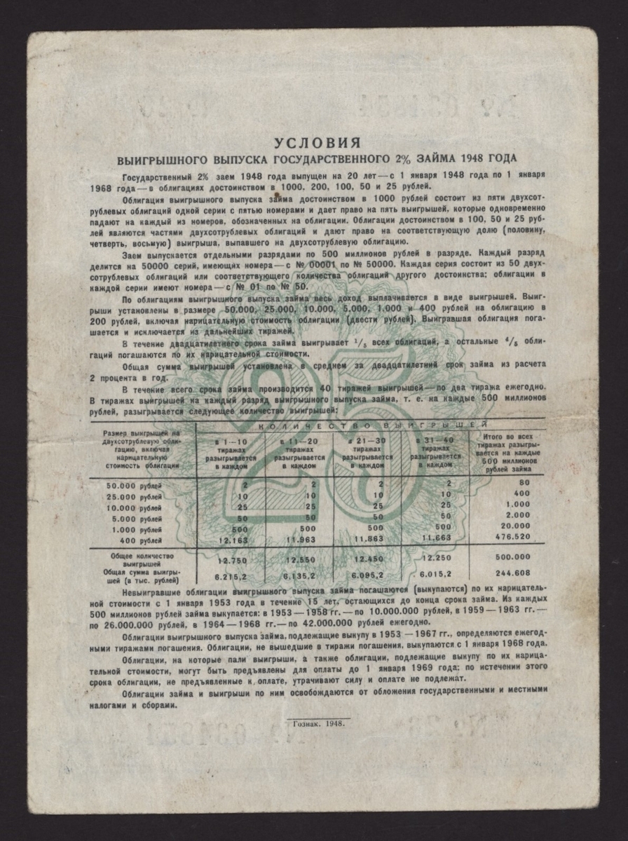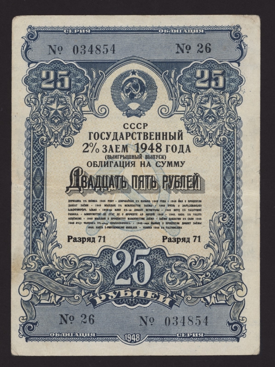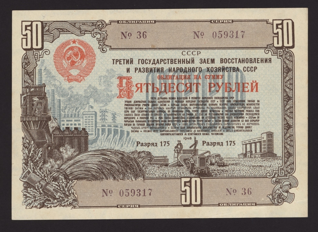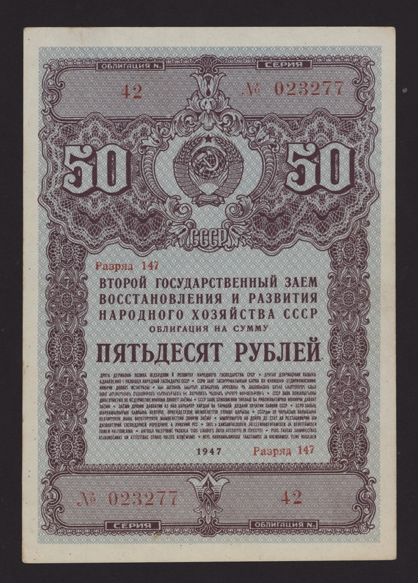 Russia, Soviet State Lottery Ticket, [3 notes] 25, 50 Rubles, 1947-8, 50 Rubles, 1947, serial number 42 023277;