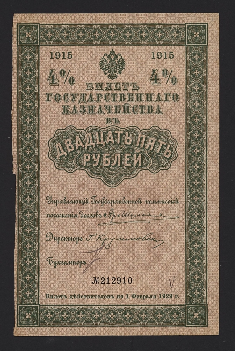 State Treasury, Russia, 25 Rubles, 1915, serial number 212910, without attached tokens, hand signed