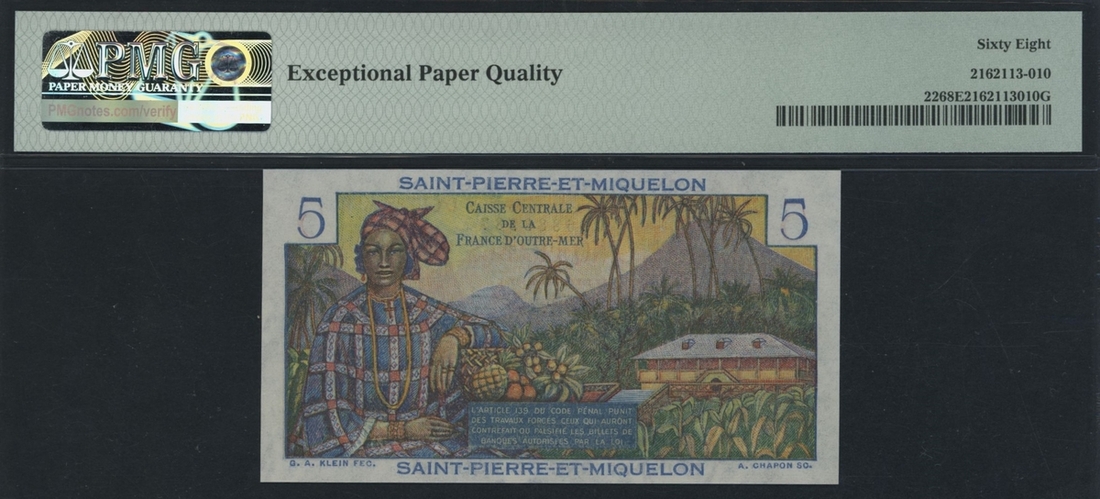 (x) Saint-Pierre & Miquelon, 5 Francs, ND (1950-60), serial number T.27 83387, (Pick 22), in PMG holder 68 EPQ Superb Gem Uncirculated