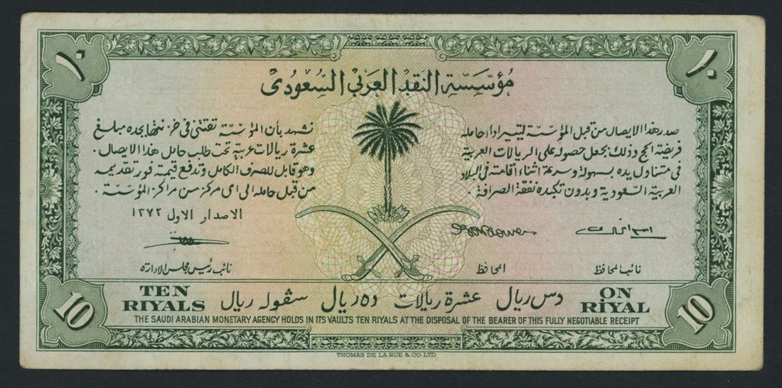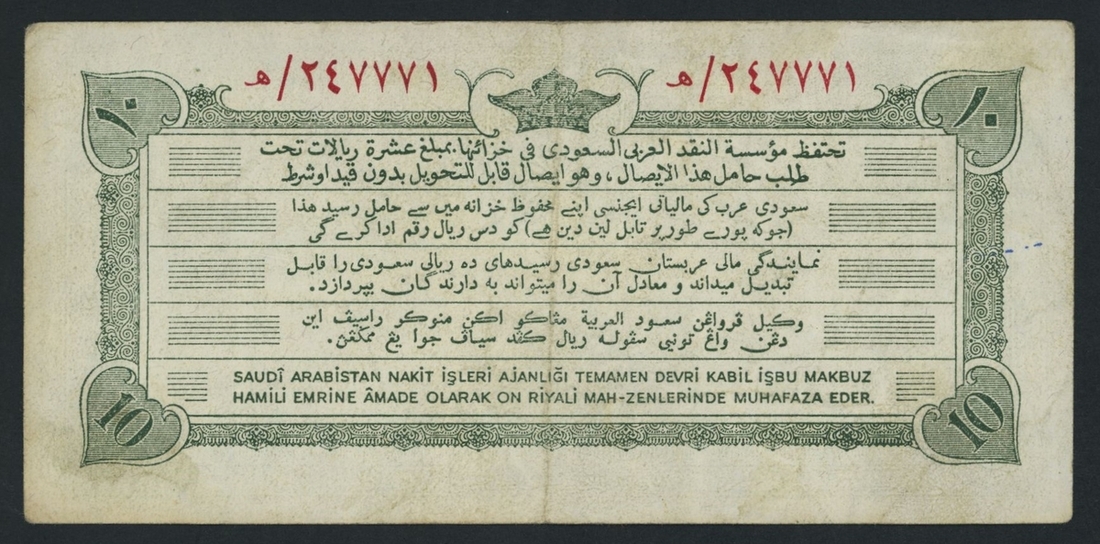 Saudi Arabia, 1953 Haj Pilgrim Receipt Issues, 10 Riyals, 1372 (1953), serial number H/247771, (Pick 1a, BNB 101a), very fine