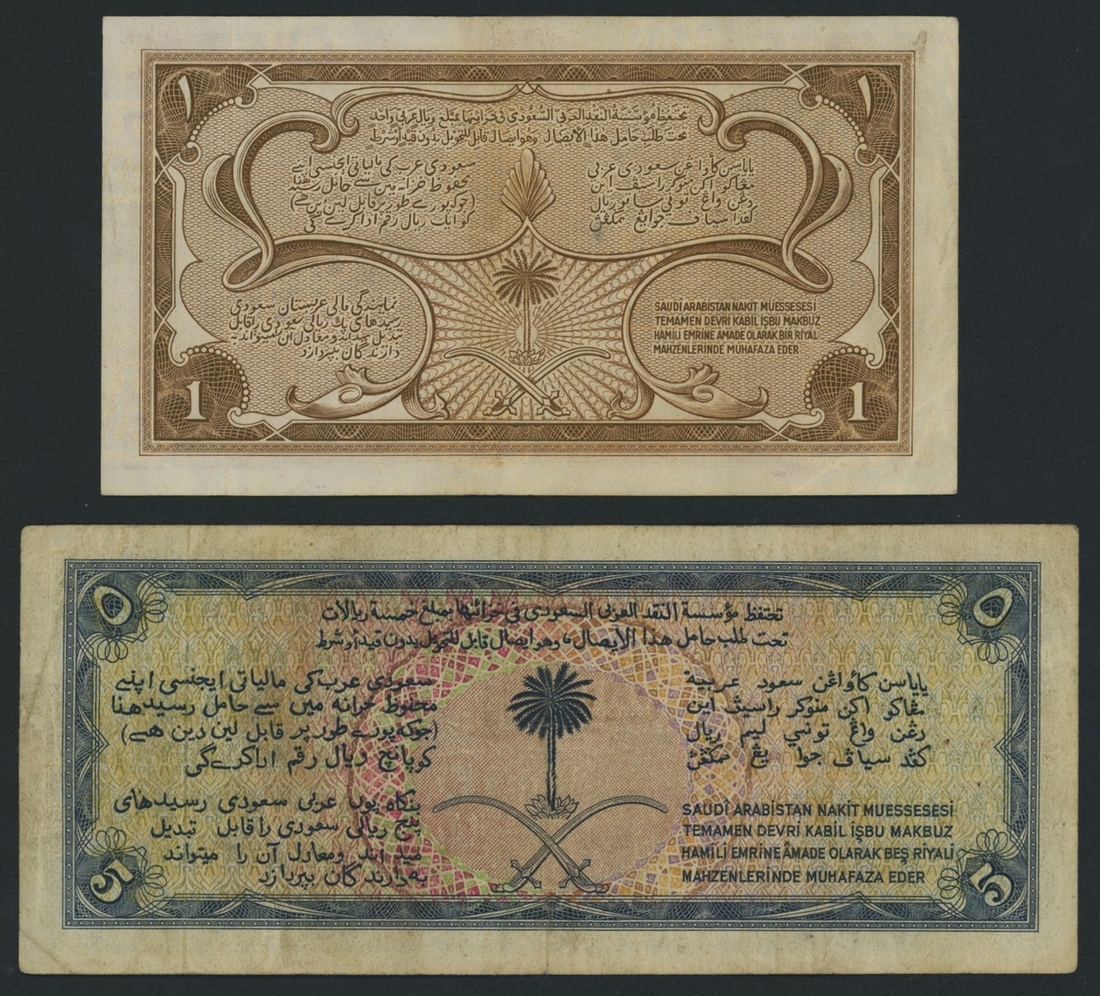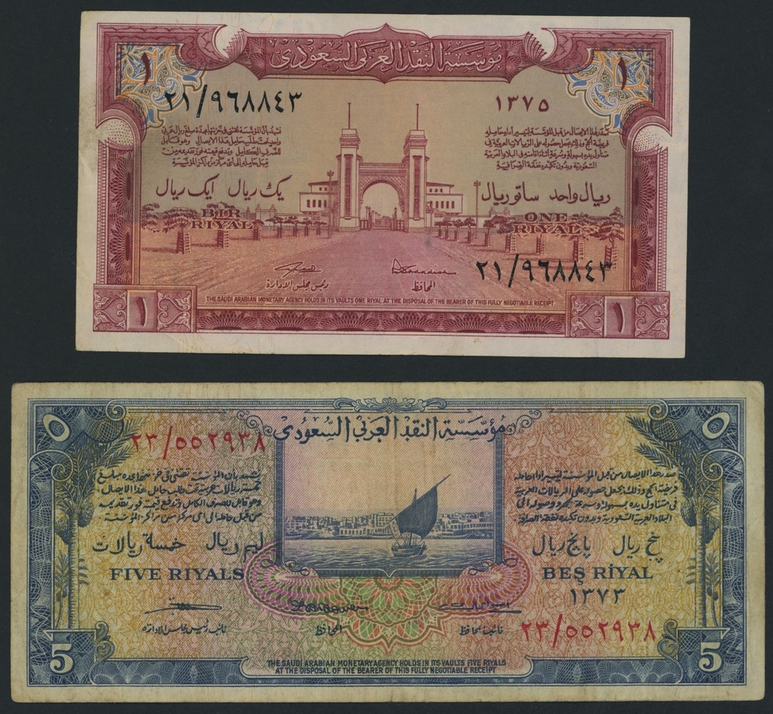 Saudi Arabia, 1955-6 Haj Pilgrim Receipt Issues, [2 notes] 1, 5 Riyals, 1955-6, 1 Riyal, 1375 (1955), serial number 21/968843,