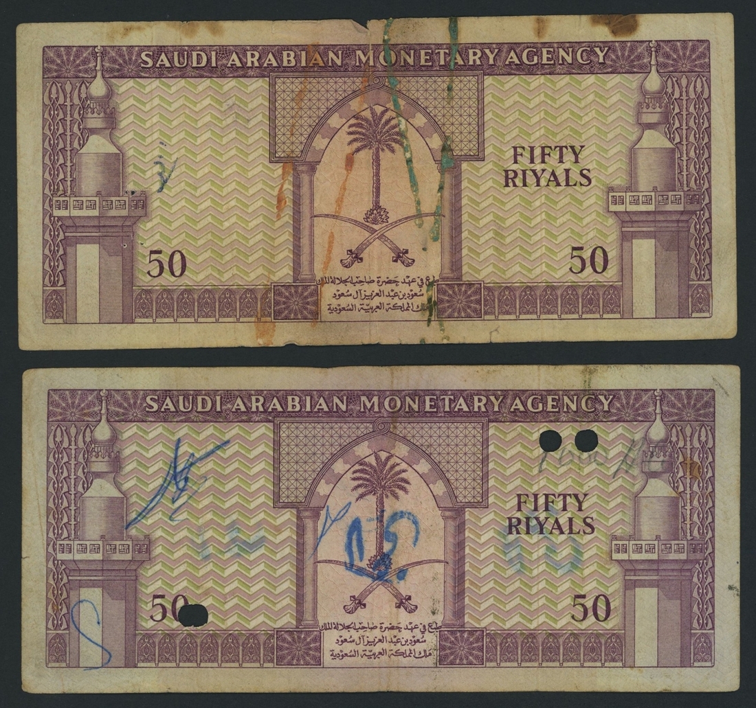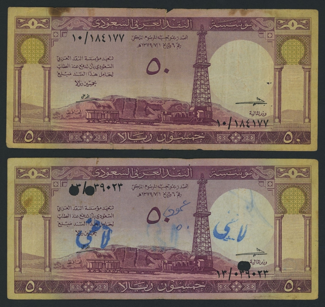 50 Riyals (2), 1379 (1961), serial numbers 10/184177 and 13/039023,