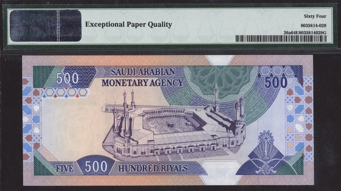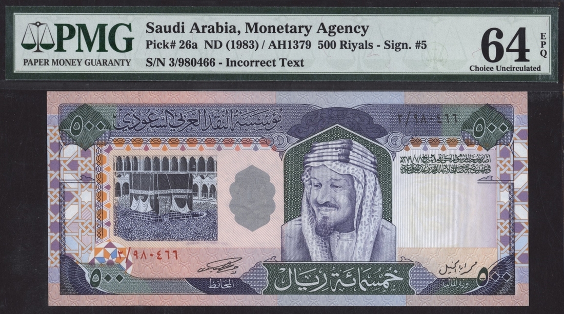 (x) Monetary Agency, Saudi Arabia, 500 Riyals, ND (1983), serial number 3/980466, incorrect text, (Pick 26a, BNB 125), in PMG holder 64 EPQ Choice Uncirculated