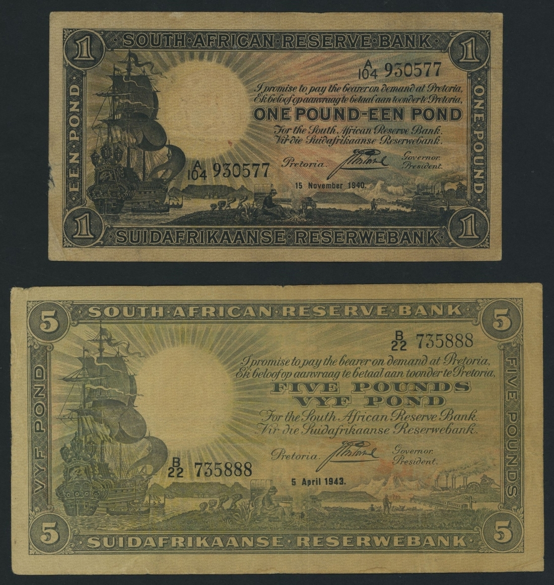(x) Reserve Bank of South Africa, [2 notes] 1, 5 Pounds, Pretoria, 1940-3,
