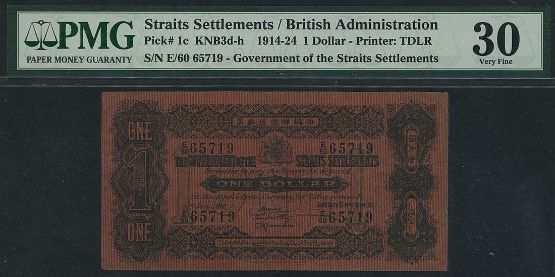 (x) Straits Settlements, British Administration, $1, 10th July 1916, serial number E/60 65719, (Pick 1c), in PMG holder 30 Very Fine