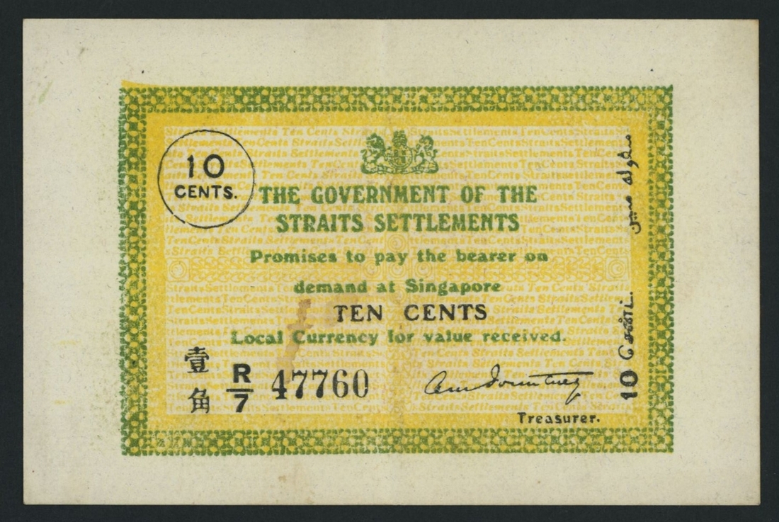 Government of the Straits Settlements, 10 Cents, ND (2nd January 1919-10th June 1920), R/7 47760, signature A. M. Pountney, as Treasurer,