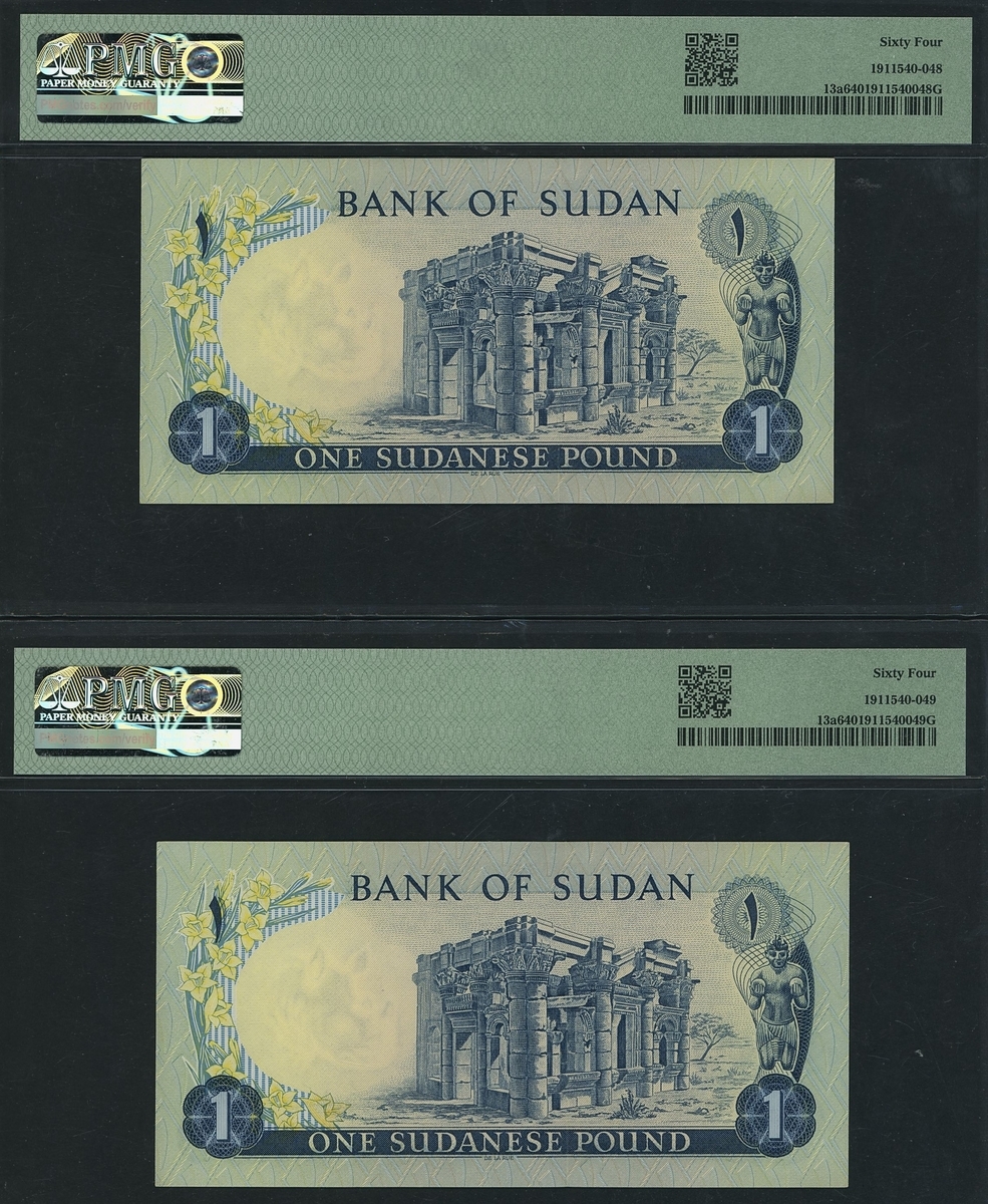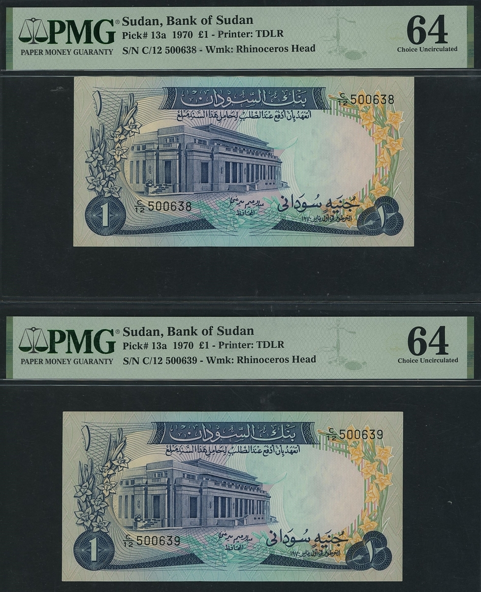 (x) Bank of Sudan, [2 notes] £1, 1970, consecutive serial numbers C/12 500638-9, (Pick 13a), in PMG holders 64 Choice Uncirculated [2 notes]