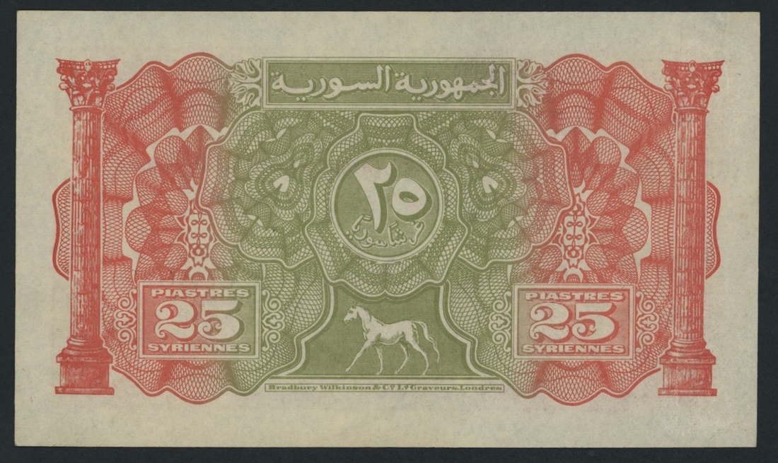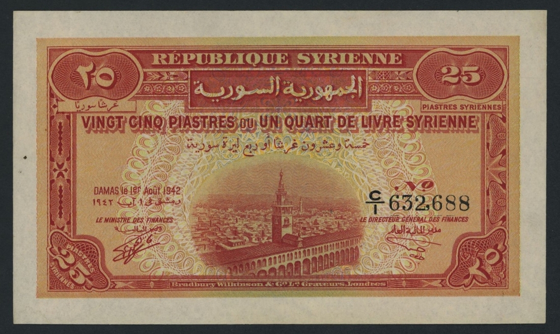 (x) Syrienne Republic, 25 Piastres, Damas, 1st August 1942, serial number C/1 632,688, (Pick 51, BNB 403), stain to left of obverse, otherwise about uncirculated
