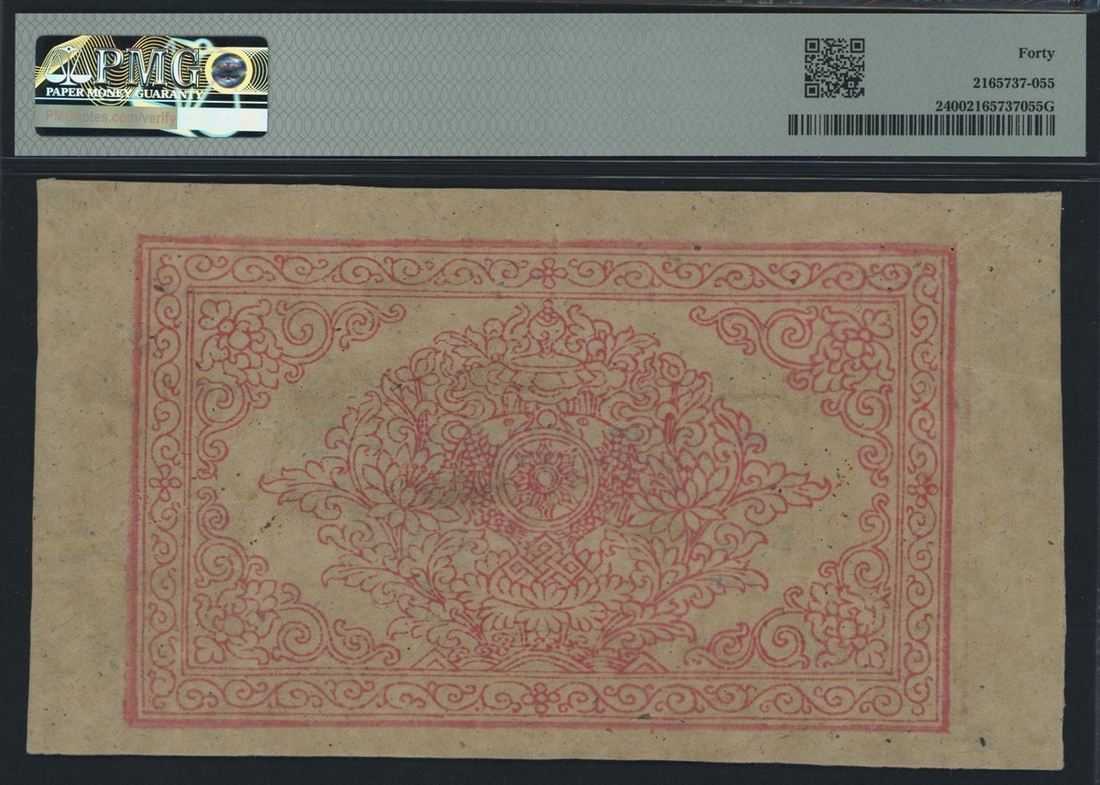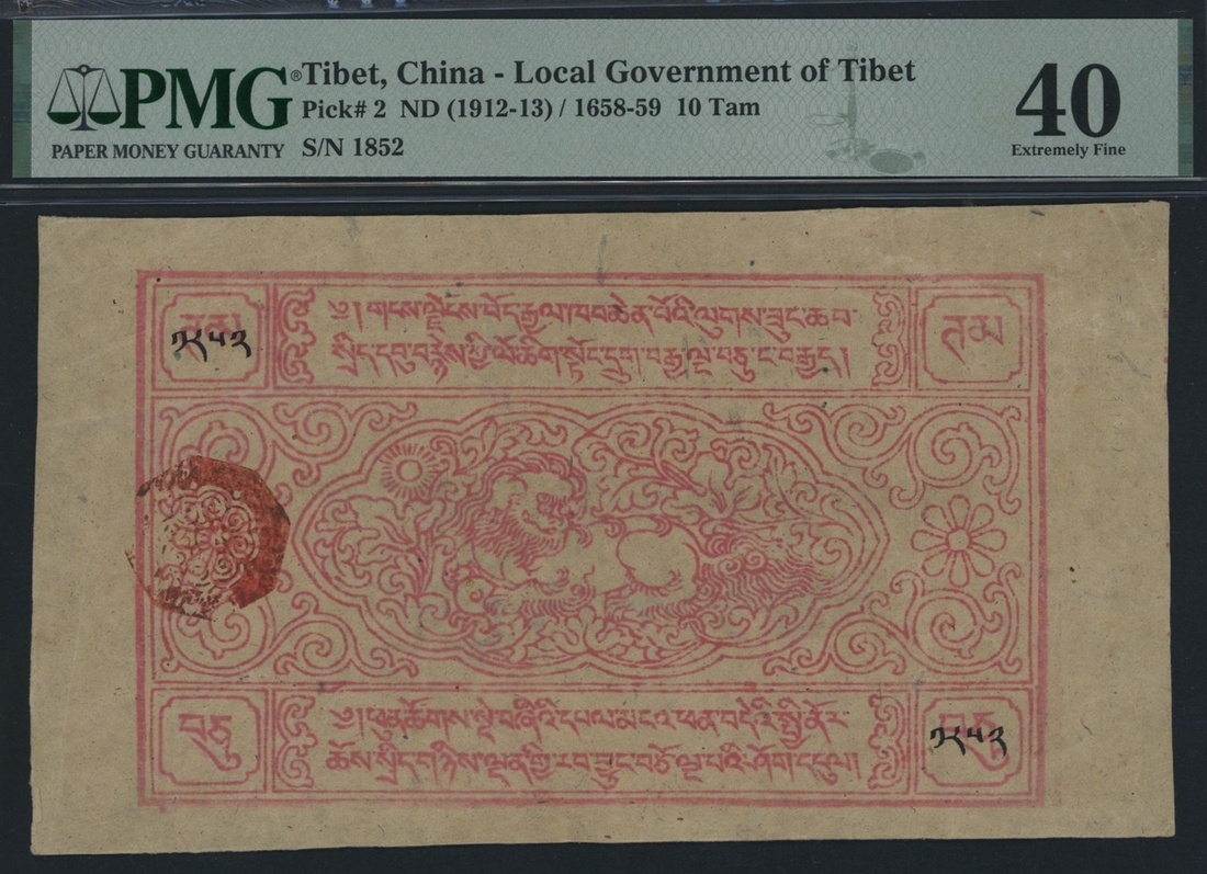 Government of Tibet, 10 Tam, ND (1912-13), serial number 1852, (Pick 2), in PMG holder 40 Extremely Fine, only 2 notes in higher grades on PMG Census!