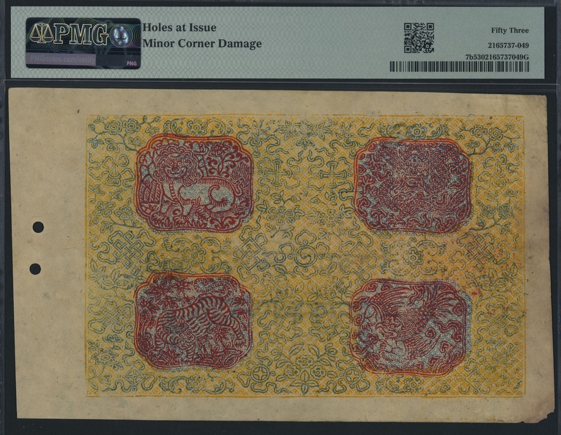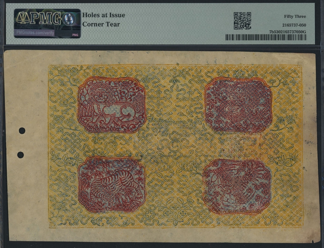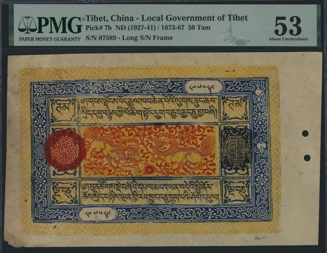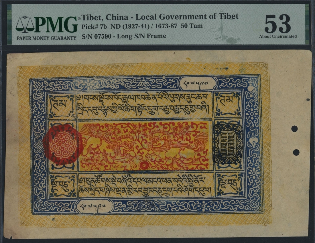 Government of Tibet, 50 Tam, ND (1927-41), consecutive serial numbers 07589-90, (Pick 7b), in PMG holders 53 About Uncirculated, holes at issue and corner tear on one note, holes at issue and minor corner damage on other note (2 notes),