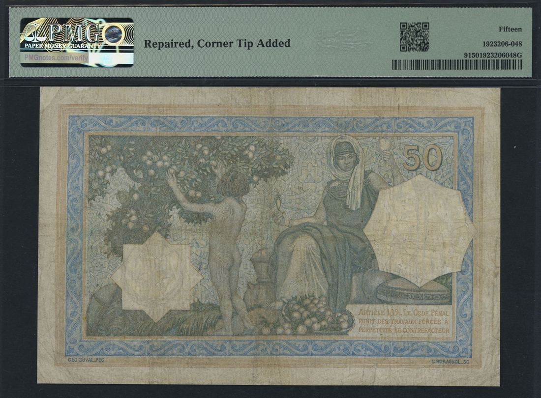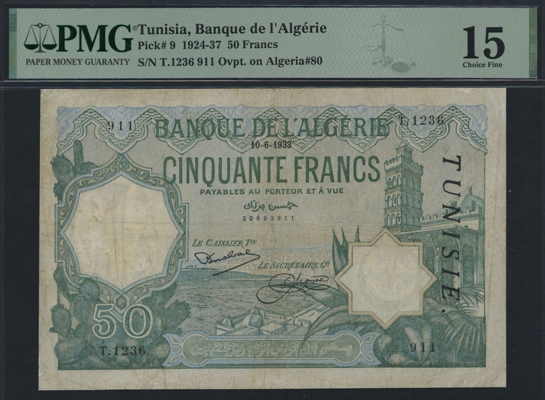 (x) Banque de l'Algérie, Tunisia, 50 Francs, 10th June 1933, serial number T.1236 911, overprint on Algeria (Pick 80),