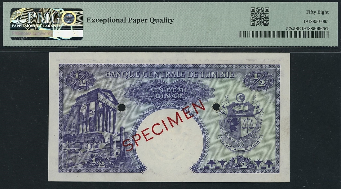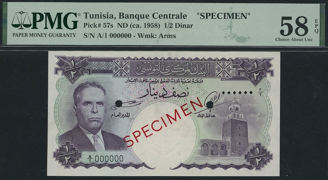 (x) Central Bank of Tunisia, specimen, 1/2 Dinar, serial number A/1 000000, (Pick 57s, BNB 501as2) in PMG holder 58 EPQ Choice About Uncirculated