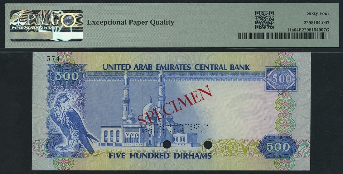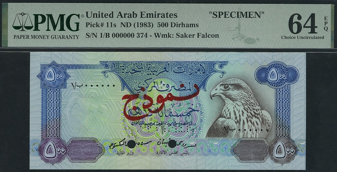 (x) United Arab Emirates, specimen 500 Dirhams, ND (1983), serial number 1/B 000000 374, (Pick 11s), in PMG holder 64 EPQ Choice Uncirculated