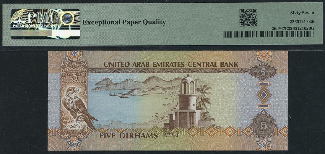 (x) United Arab Emirates, replacement 5 Dirhams, 2015, serial number 999002610, (Pick 26c, BNB B226bz), in PMG holder 67 EPQ Superb Gem Uncirculated