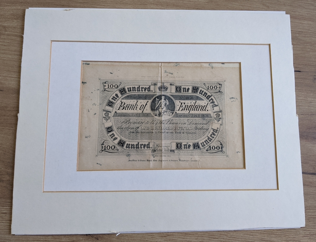 Bradbury & Evans House Note, specimen £100, ND, serial number A/Z 1856, an early Bank of England note design with 'Henry Bradbury's Specimen of a Complex Bank Note' written in the upper margin,