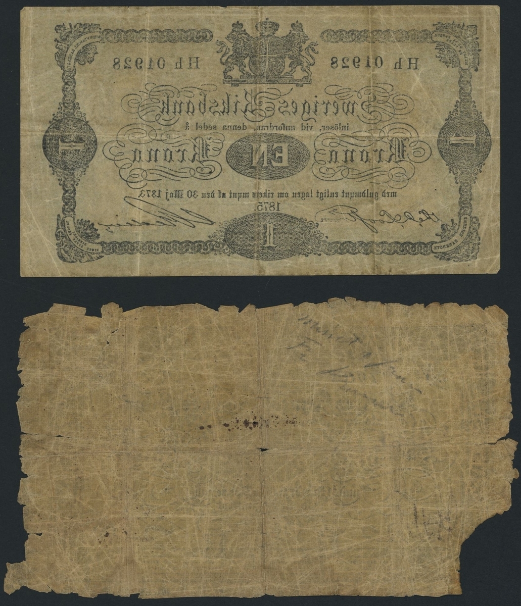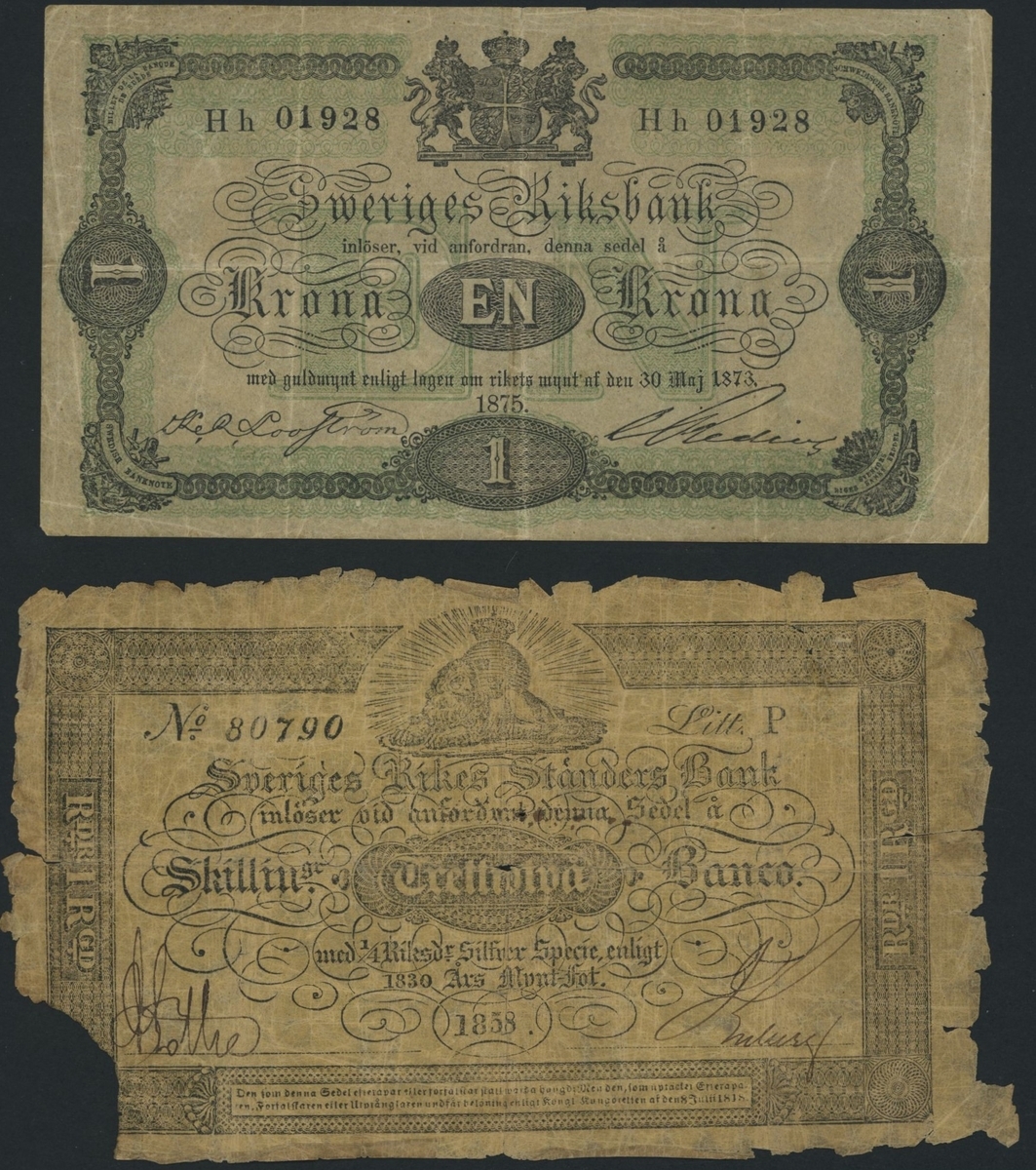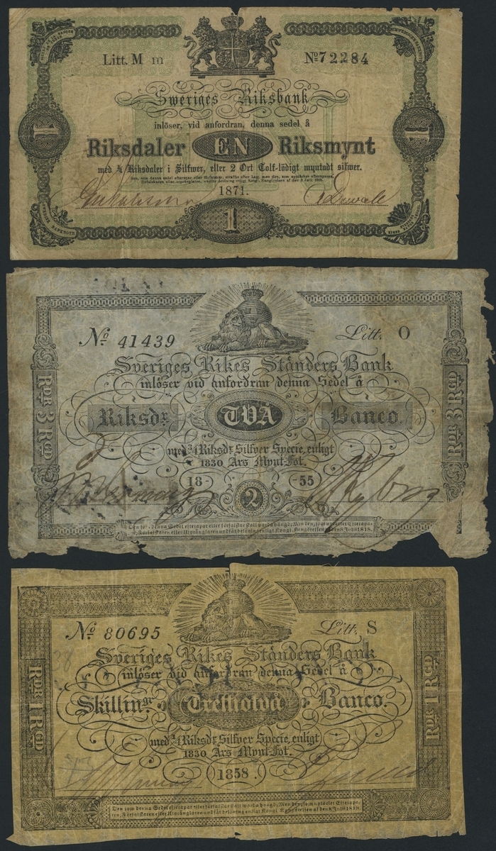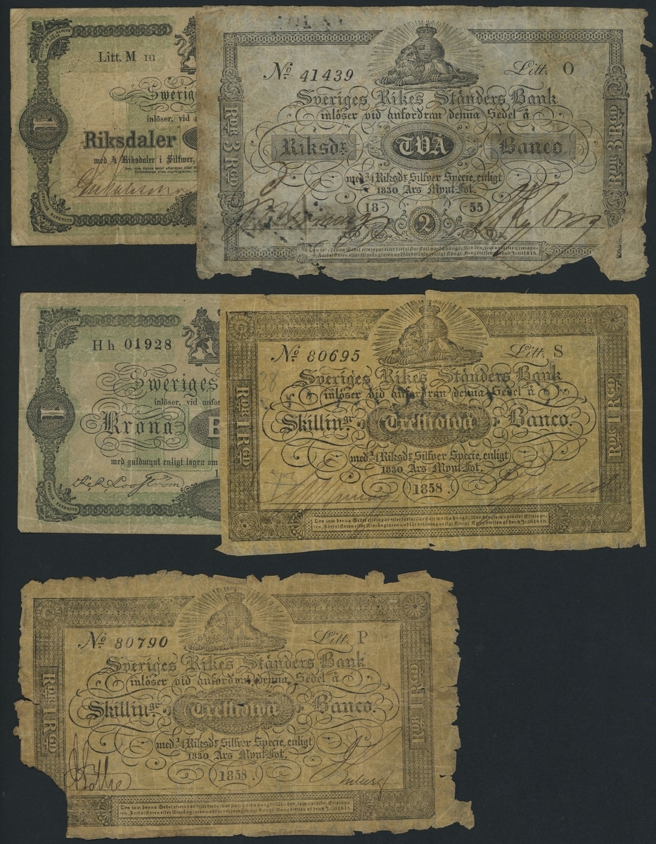 Rikes Ständers Bank & Riksbank, Sweden, [5 notes] 1 Krona, 2 Riksdaler, 32 Skilingar Banco,