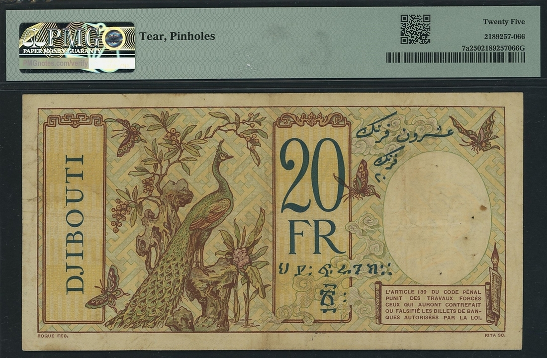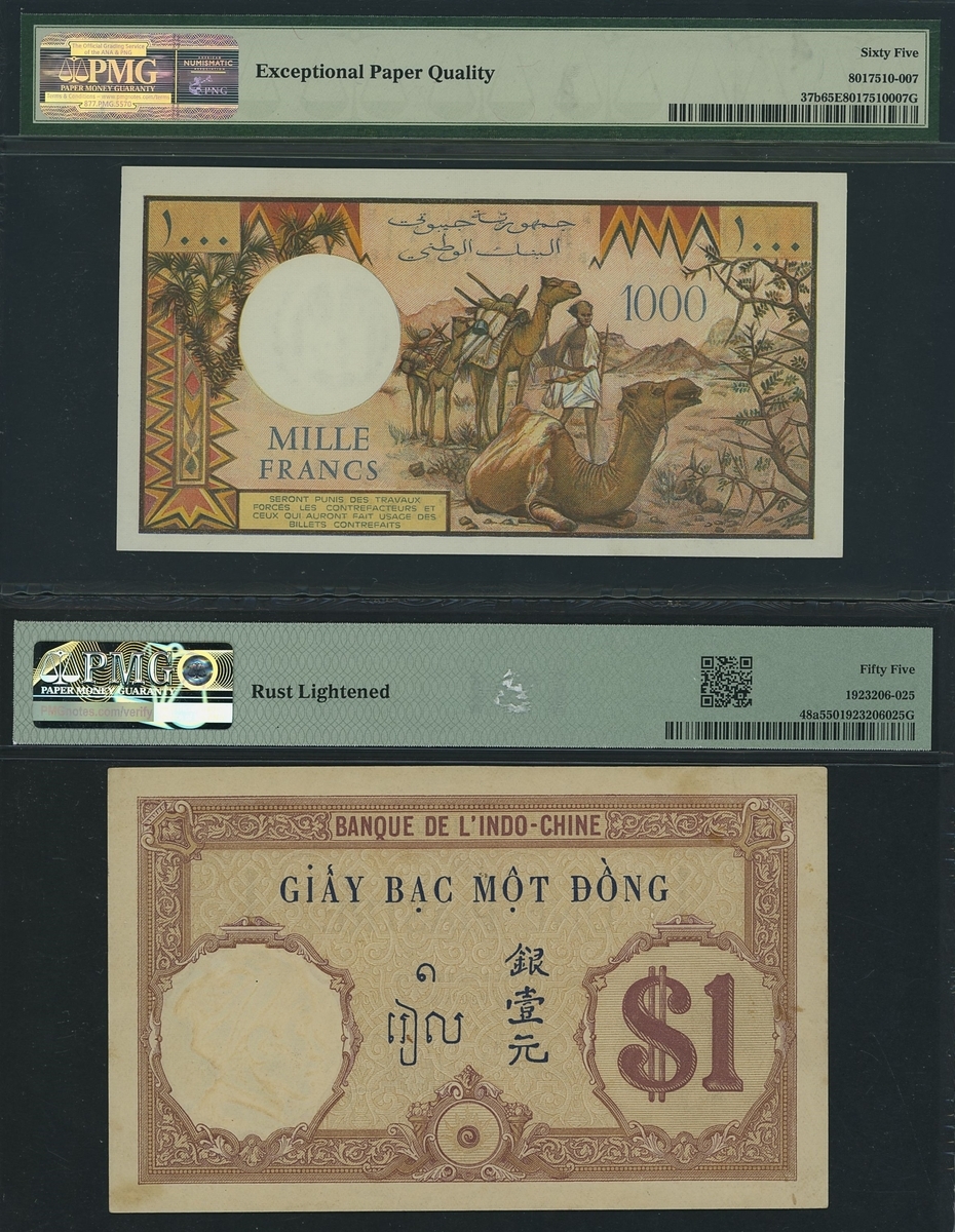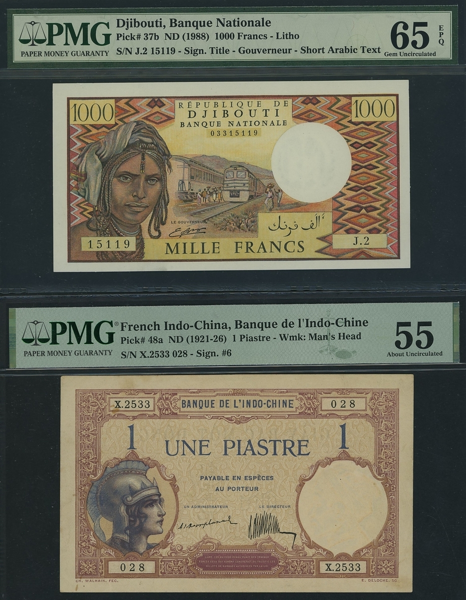 (Pick 37b, 48a, 7a), in PMG holders 25 Very Fine to 65 EPQ Gem Uncirculated (3 notes), only 8 notes in a higher grade for the French Somaliland note on PMG Census