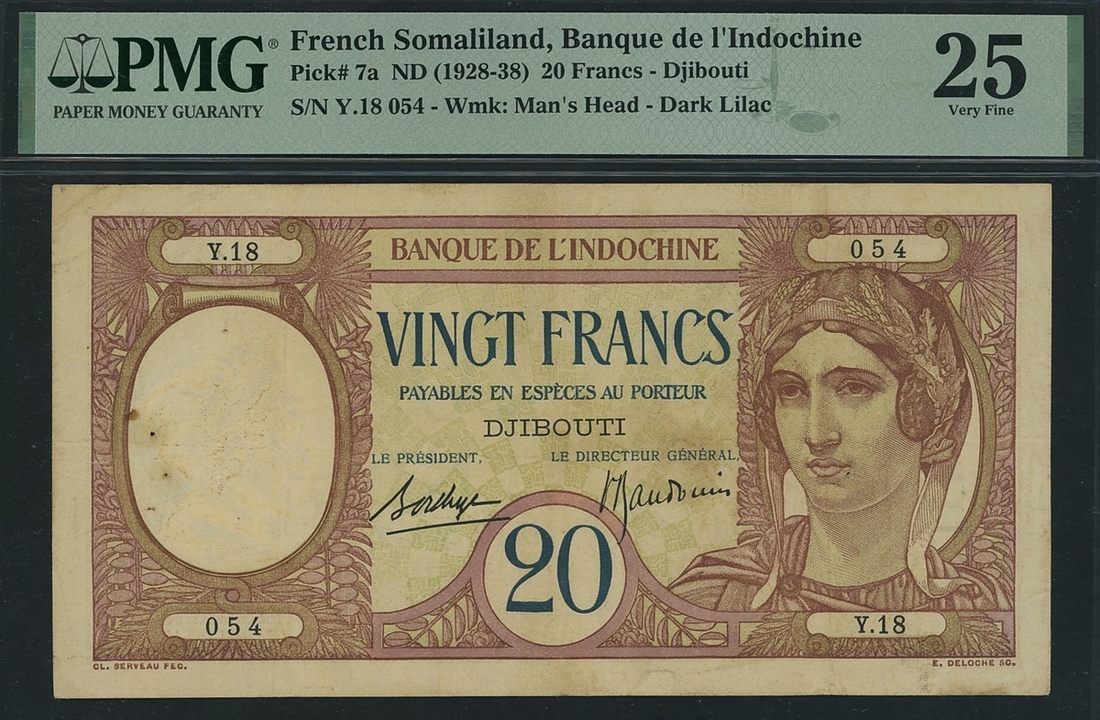 French Somaliland, Djibouti, 25 Francs, ND (1928-38), serial number Y.18 054,