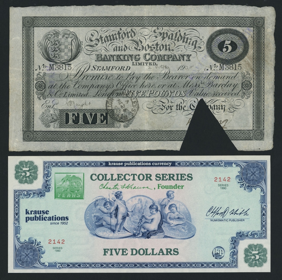 Stamford Spalding and Boston Banking Co, cut cancelled, £5, 1905, serial number M3815,