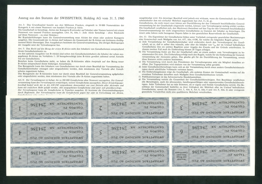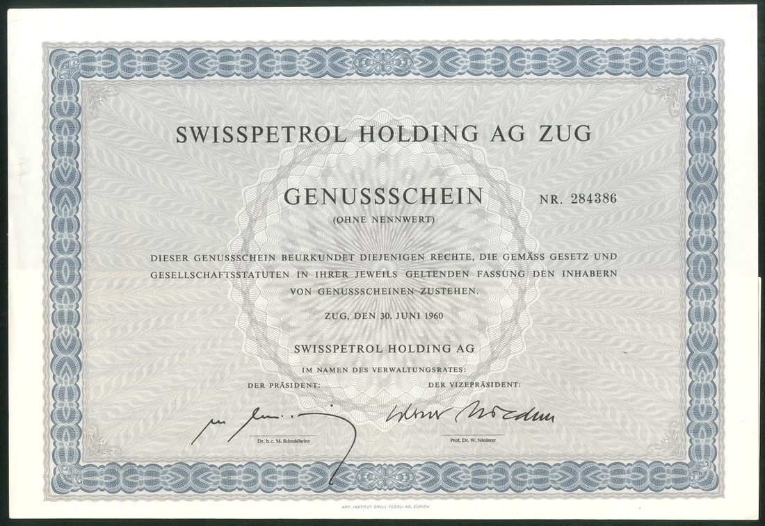 Share Document of Swiss Oil Prospecting Venture 'Swisspetrol', 25 Shares, Purchased on 17th October 1980 at a total cost of 1,819.65 SFr. Unfortunately, on 10th June 1994, Swisspetrol went into liquidation, but original purchaser was given the physical document of the shares as a memento. Lot comes with a photocopy of the correspondence of purchaser for own records